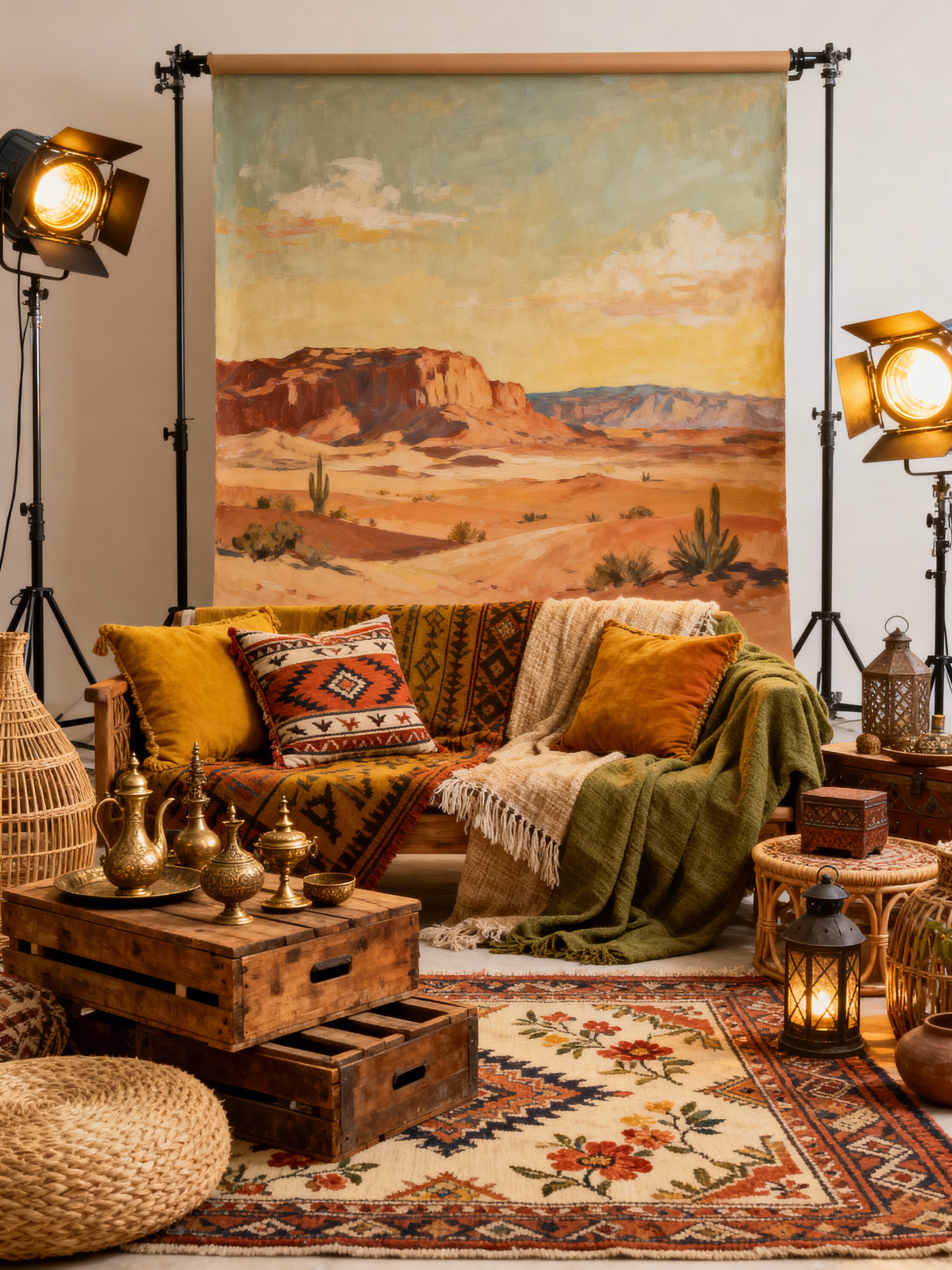 movie set with boho-chic style with movie set and film set interior and movie set and softbox lights and film set interior and movie set and movie backdrop and professional movie set. . with free-spirited and relaxed atmosphere and earthy colors and global artifacts and vintage finds and mixed patterns and bohemian flair and natural materials