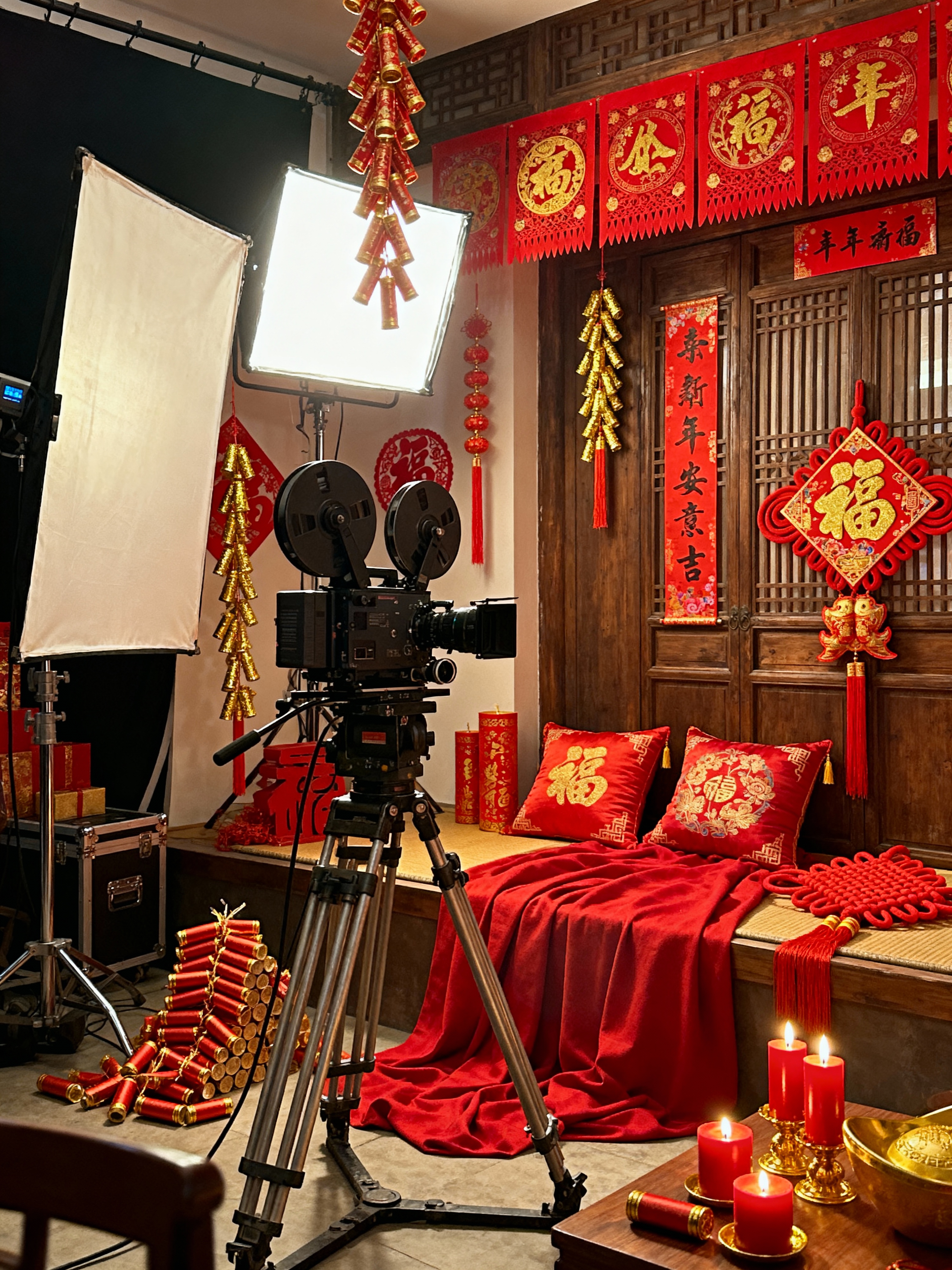 movie set with chinese new year style with movie set and camera on tripod and movie set and film lighting equipment and reflector panels and film set interior and cinematic lighting and film set interior. . with paper firecrackers and paper cuttings and door couplets and red and gold tassels and red fabric & pillows and chinese knots and fai chun banners and red and gold candles