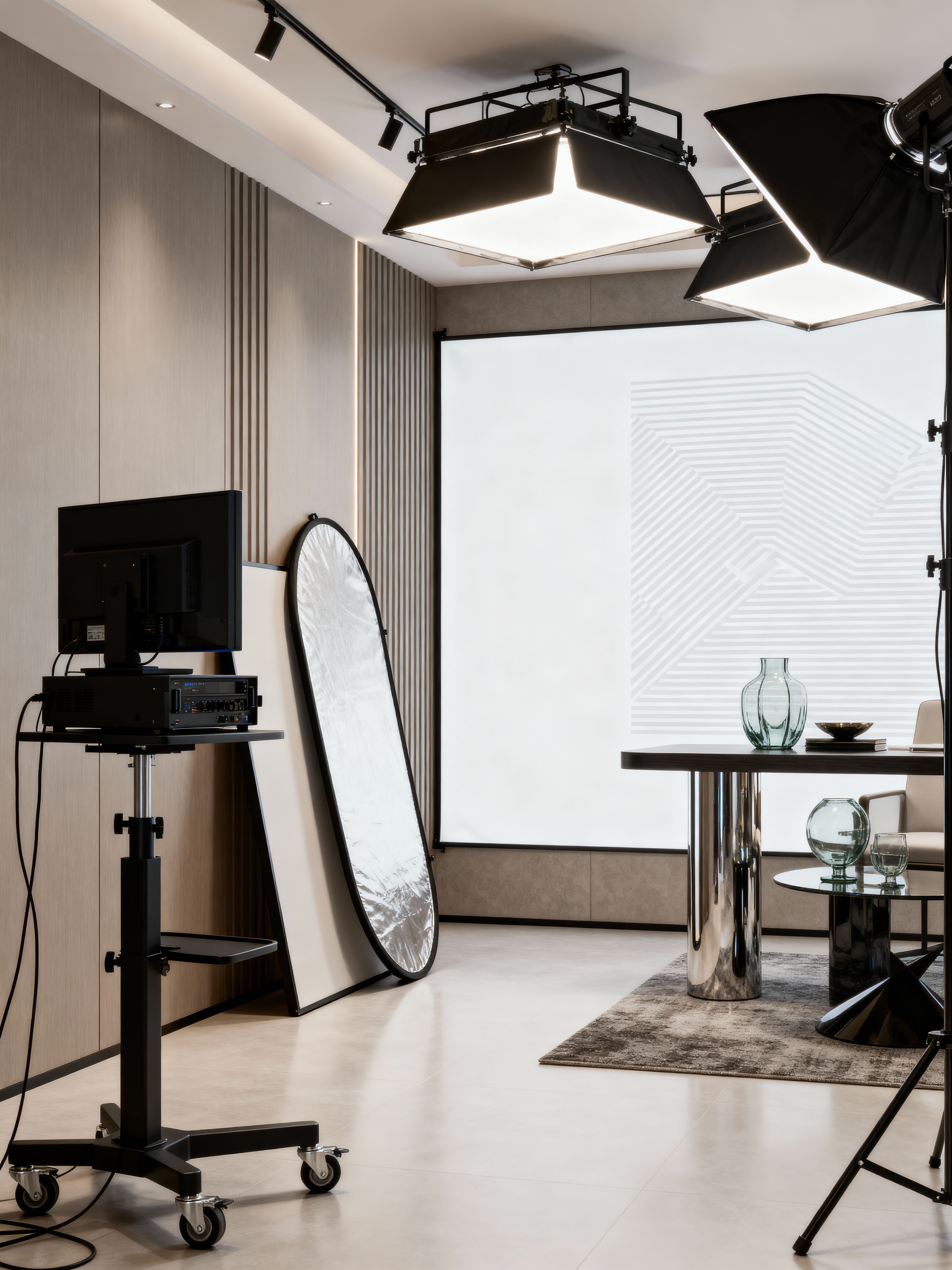 movie set with contemporary style with director monitor and reflector panels and softbox lights and movie set and movie set and movie backdrop and professional movie set and film set interior. . with neutral palette and modern finishes and metal accents and glass decor and high contrast and clean look and functional design and elegant simplicity
