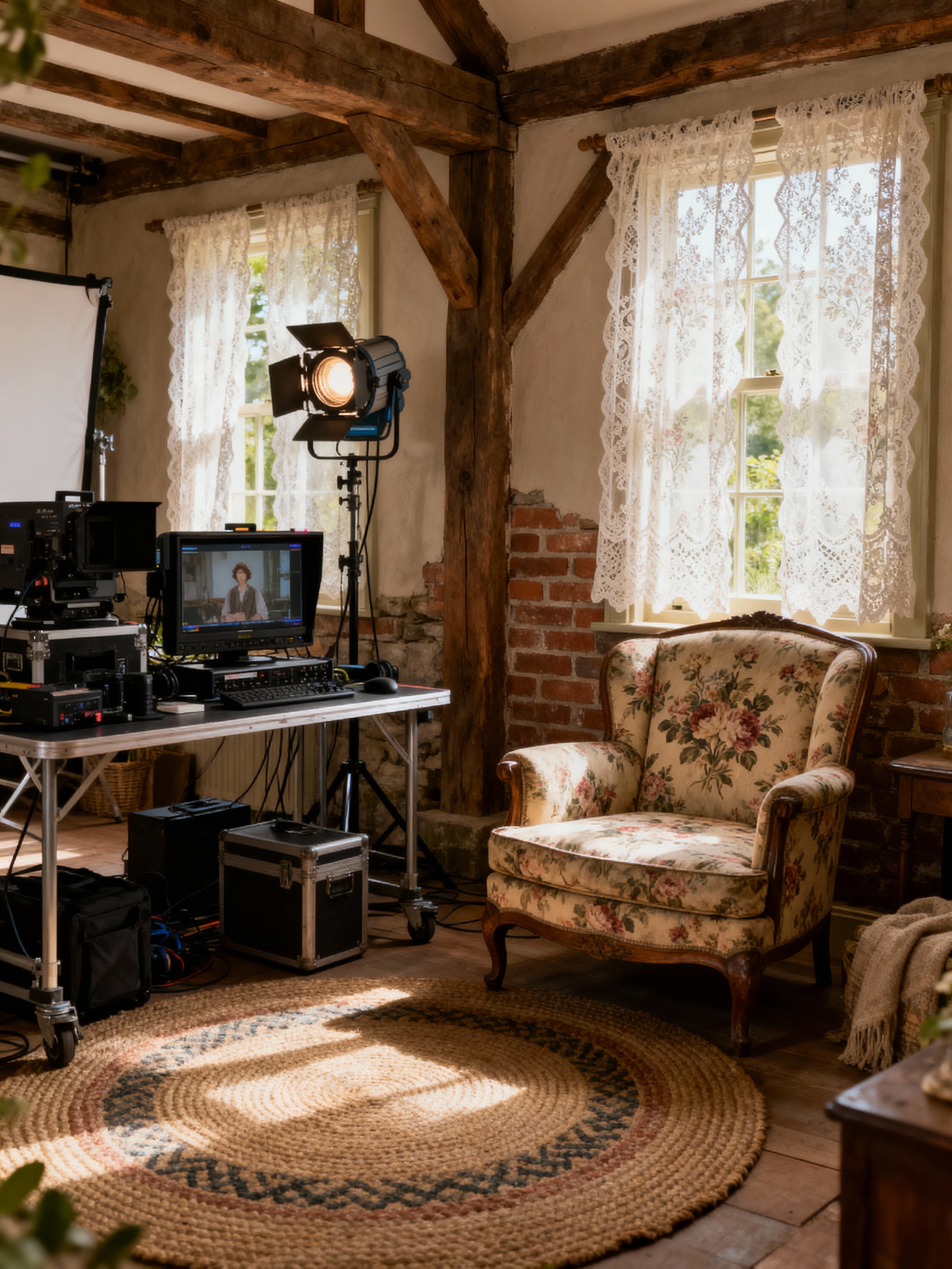 movie set with cottagecore style with movie set and professional movie set and cinematic lighting and professional lighting equipment and equipment table and director monitor and professional movie set and film set interior. . with organic and rustic and country style and earthy and natural and muted colors and traditional and floral patterns