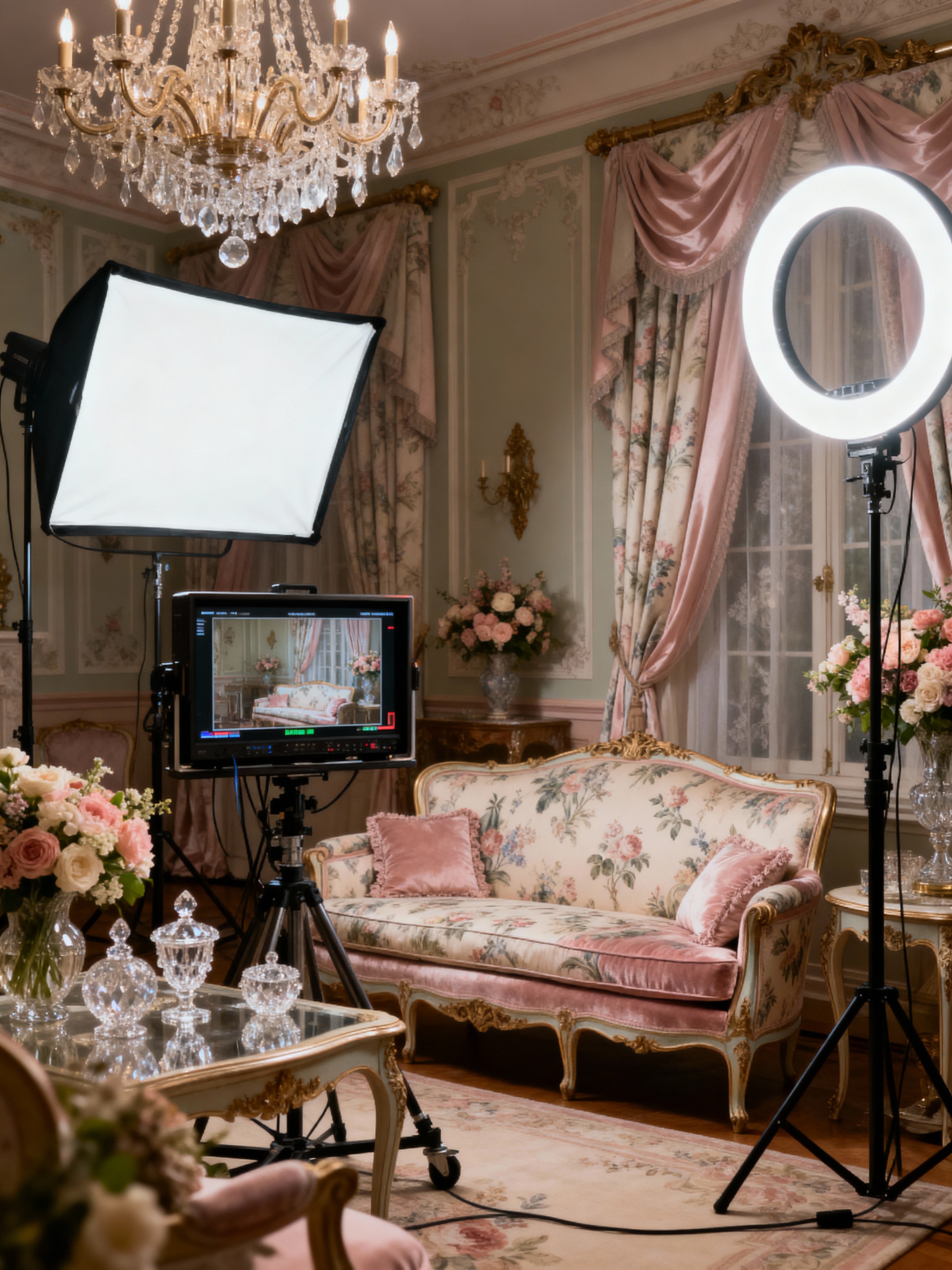 movie set with french style with cinematic lighting and movie set and film set interior and professional movie set and softbox lights and ring light and director monitor and professional movie set. . with refined luxury and romantic style and provincial charm and sophisticated grace and soft pastels and crystal accents and ornate furniture and toile patterns