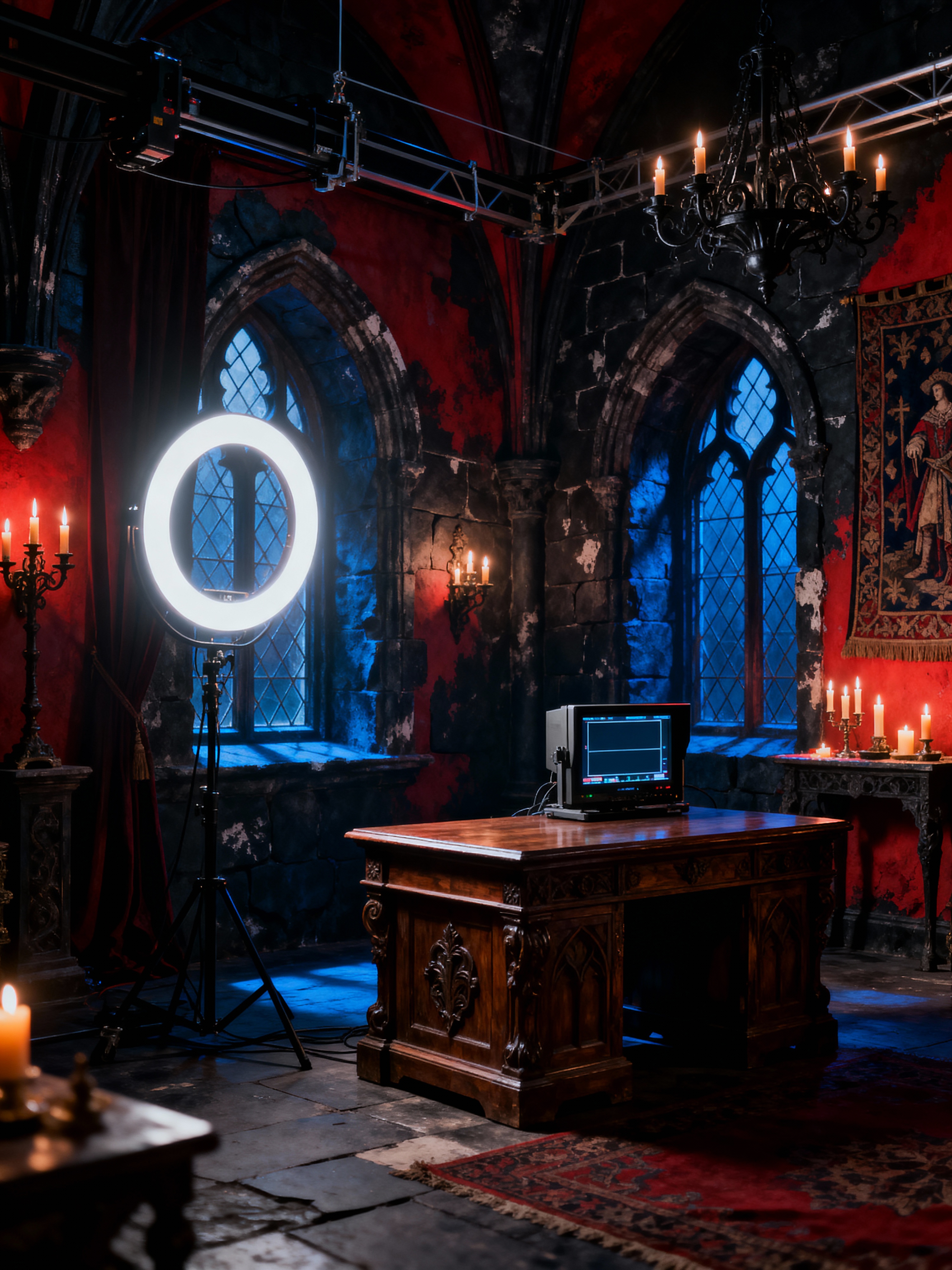 movie set with gothic style with professional movie set and ring light and film set interior and professional movie set and director monitor and movie set and film set interior and professional movie set. . with heavy furniture and arched windows and candlelit ambiance and dramatic atmosphere and mysterious mood and dark colors and stone textures and medieval influence