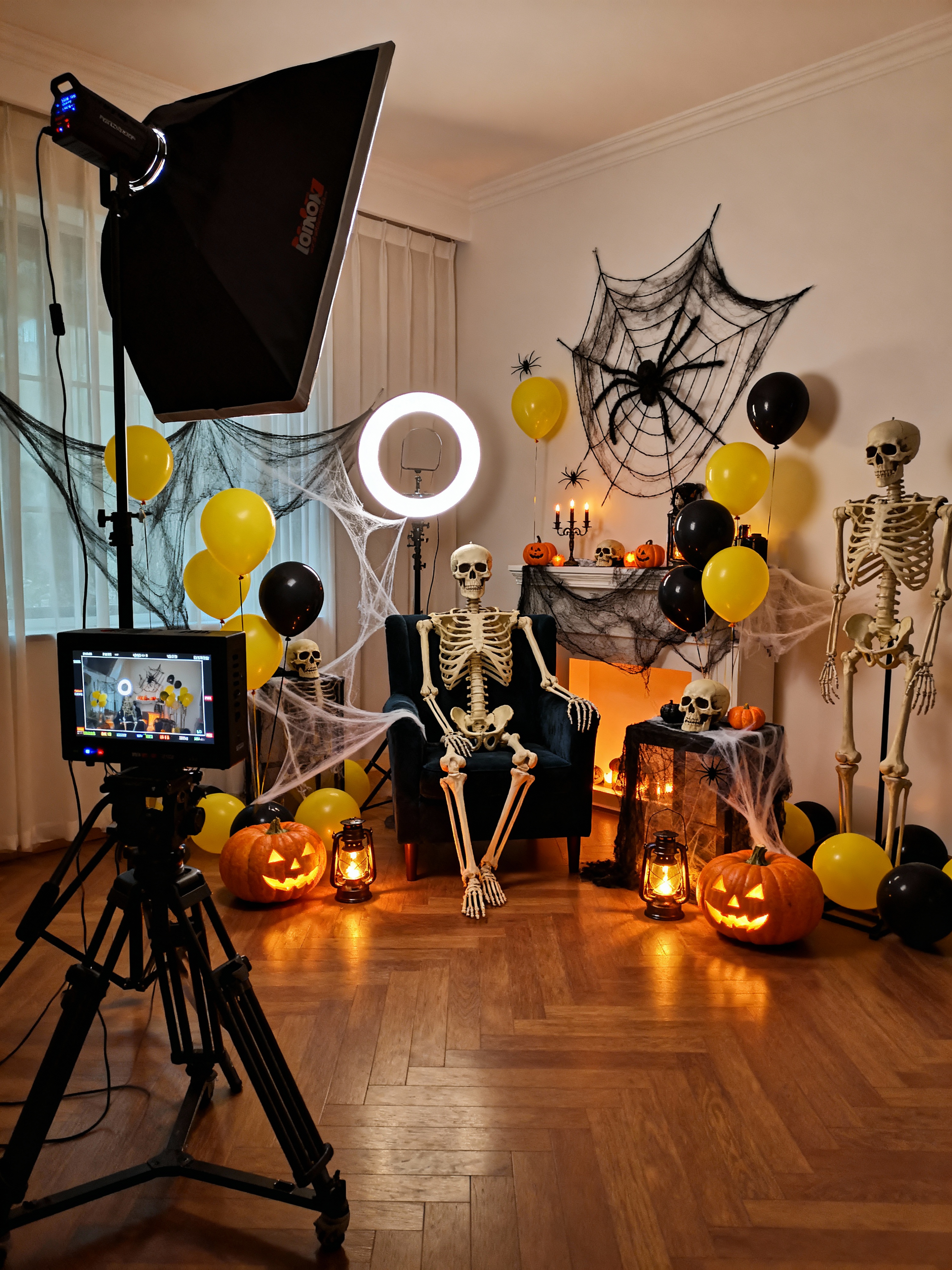 movie set with halloween style with reflector panels and director monitor and softbox lights and film set interior and ring light and movie set and cinematic lighting and professional movie set. . with cobwebs and yellow black balloons and skeletons sitting and standing and human skulls and glowing pumpkins and lanterns and spiderwebs and lanterns