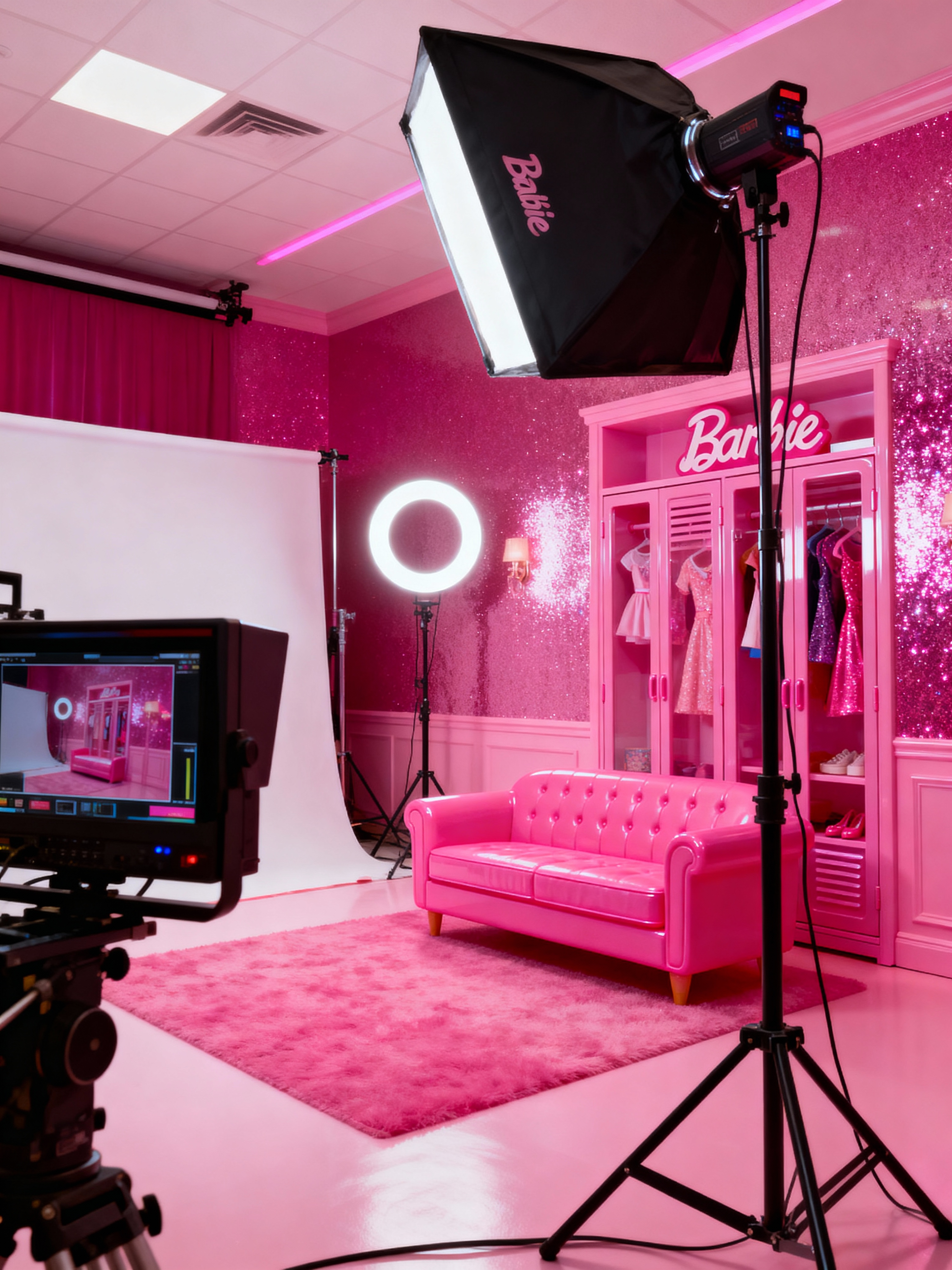 movie set with hot pink style with movie backdrop and professional lighting equipment and film set interior and ring light and film set interior and director monitor and professional movie set and film set interior. . with barbie sofa and hot pink barbie colors and hot pink barbie walls and barbie glitter and sparkle and barbie closet and barbie style interior and barbie plastic interior and barbie bold rosy hues like fuchsia and magenta