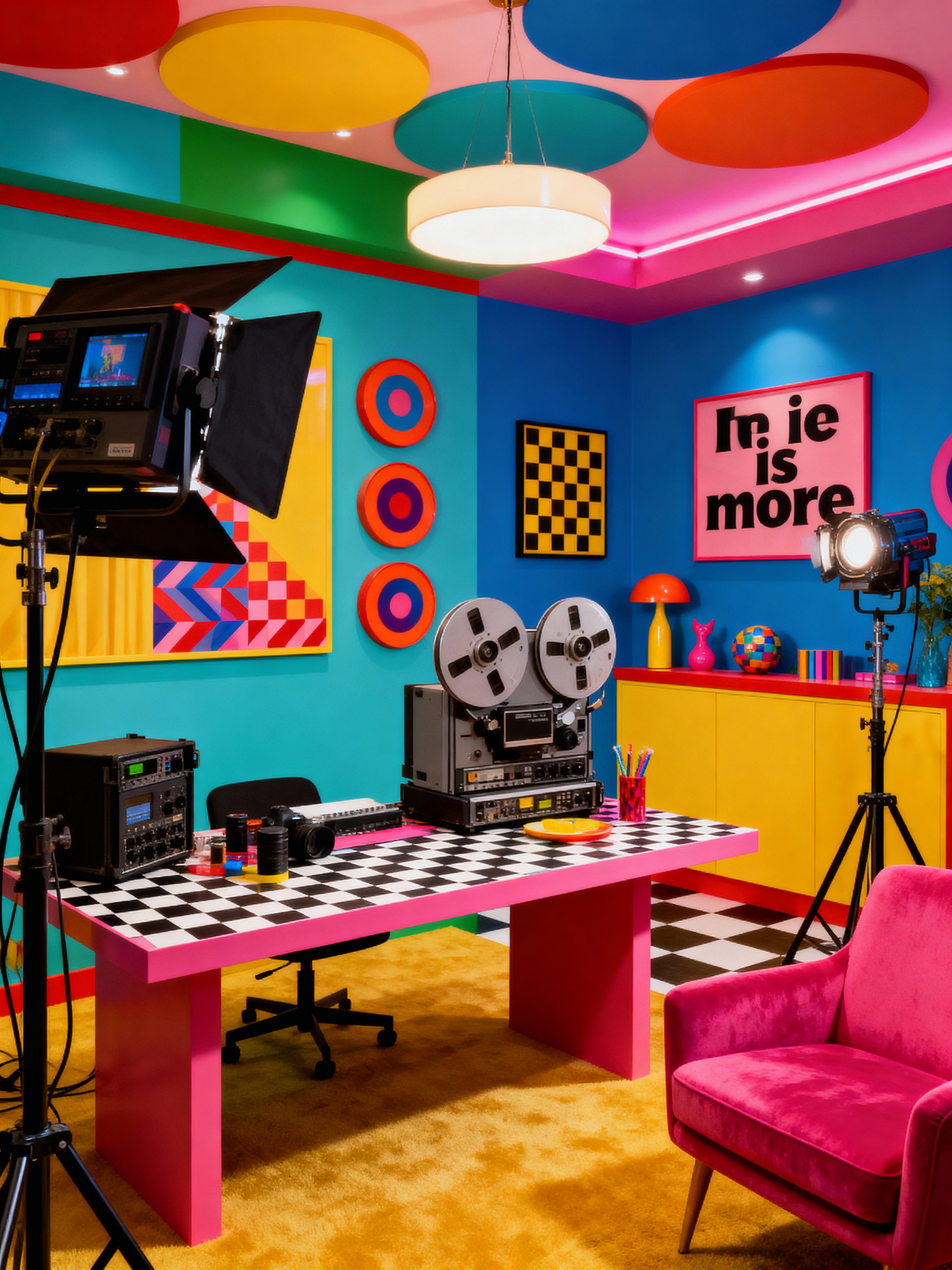 movie set with maximalist style with film set interior and professional movie set and cinematic lighting and film production set and equipment table and professional movie set and professional movie set and movie set. . with bold design and playful and bold patterns and eye-catching and more is more philosophy and bold colors and vibrant and bold creativity