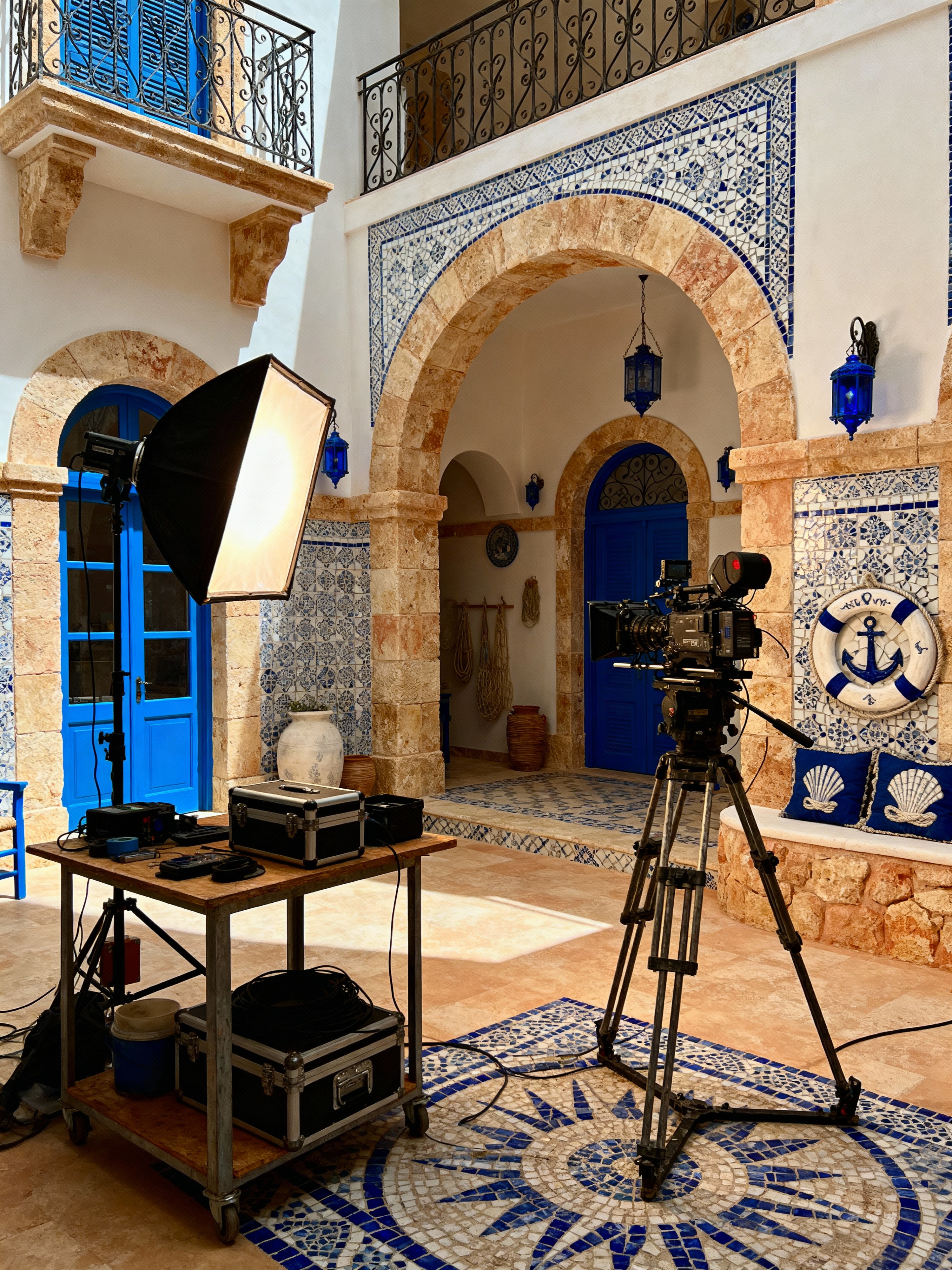 movie set with mediterranean style with softbox lights and movie set and film set interior and equipment table and movie set and professional movie set and camera on tripod and cinematic lighting. . with sun-drenched and warm earth tones and stone accents and arched doorways and mosaic patterns and coastal influence and wrought iron and blue and white
