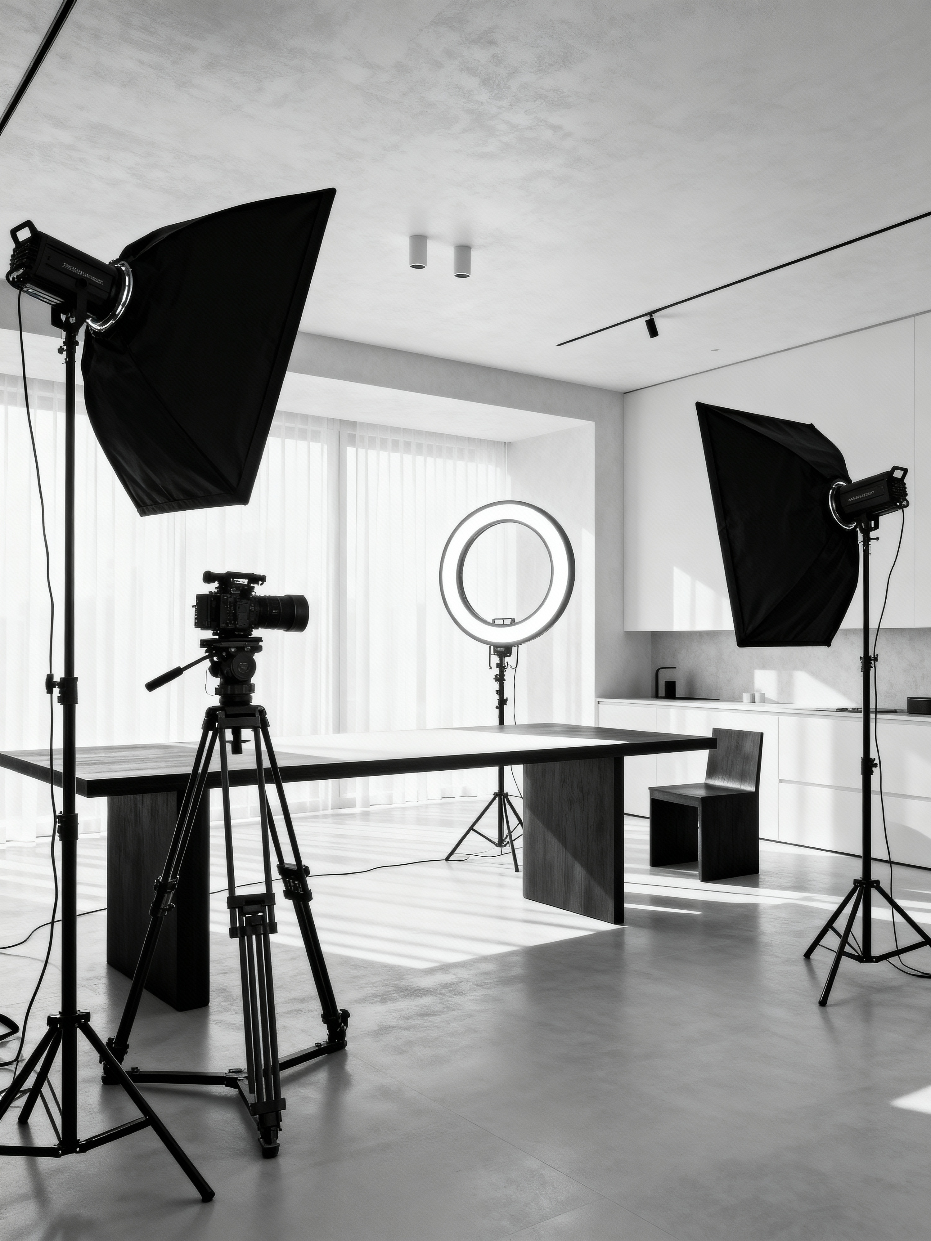 movie set with minimalist style with equipment table and film lighting equipment and professional lighting equipment and ring light and film set interior and softbox lights and reflector panels and camera on tripod. . with functional furniture and an open floor plan and focus on the shape, colour and texture of just a few of essential elements and a monochromatic palette with colour used as an accent and clean lines and lots of light and functional furniture