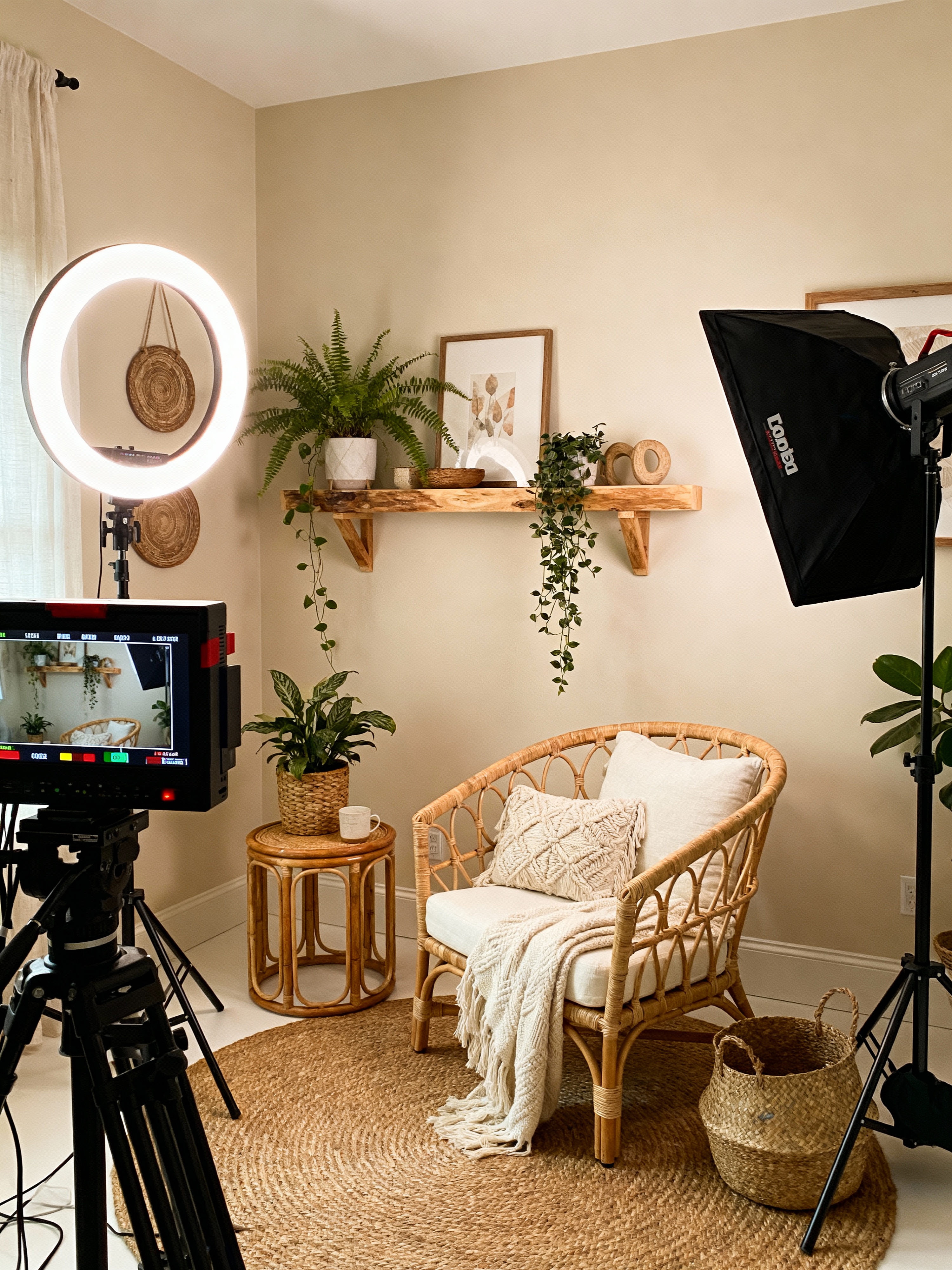 movie set with modern boho style with professional movie set and director monitor and ring light and reflector panels and film production set and movie set and softbox lights and professional lighting equipment. . with comfortable and neutral palette and rattan furniture and collected look and cotton textiles and jute rugs and hanging plants and wood decor