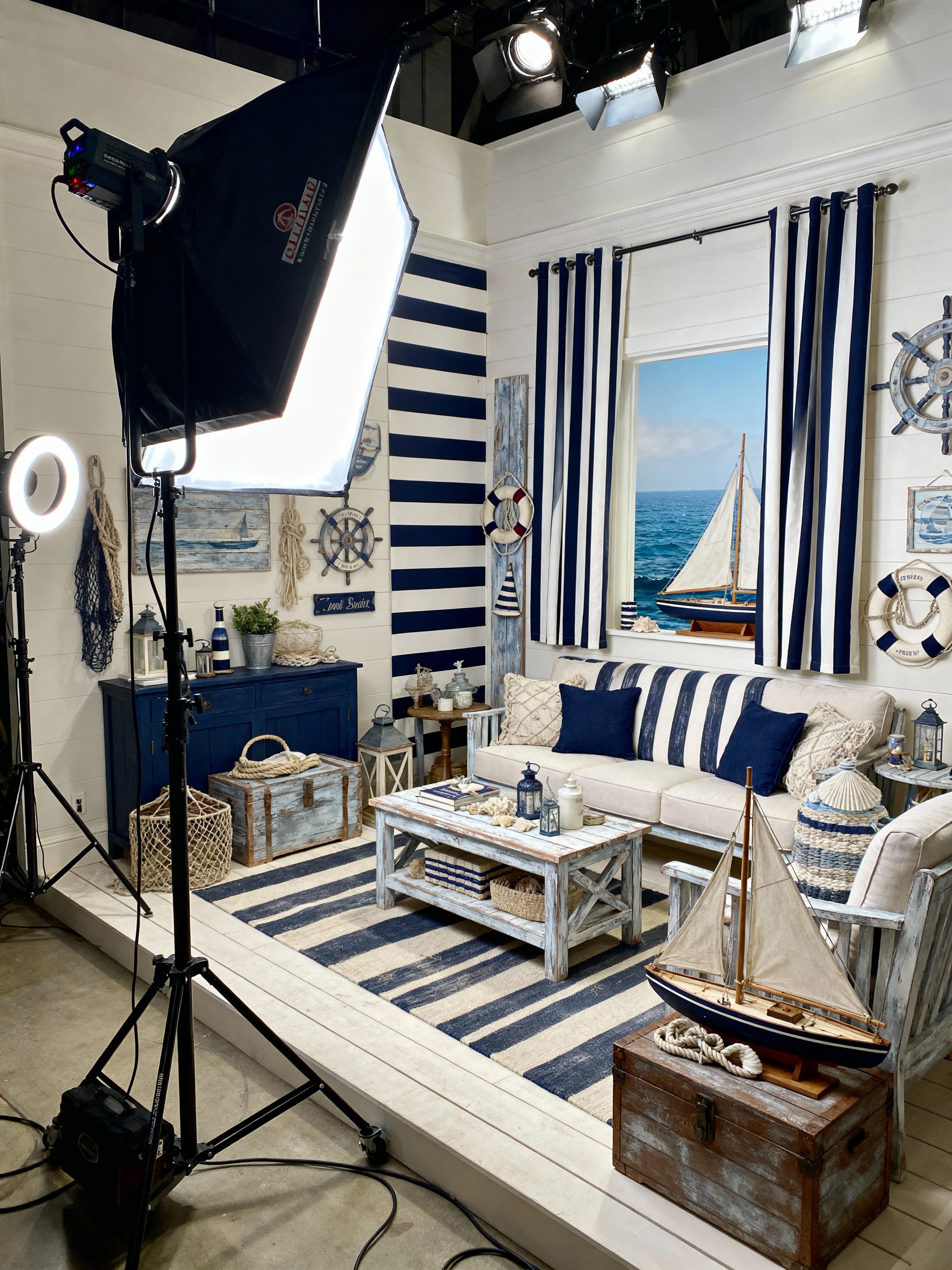 movie set with nautical style with professional lighting equipment and film set interior and softbox lights and professional movie set and movie set and ring light and movie set and cinematic lighting. . with striped patterns and navy blue and maritime decor and coastal vibes and weathered wood and seaside charm and sailboat elements and ocean inspiration
