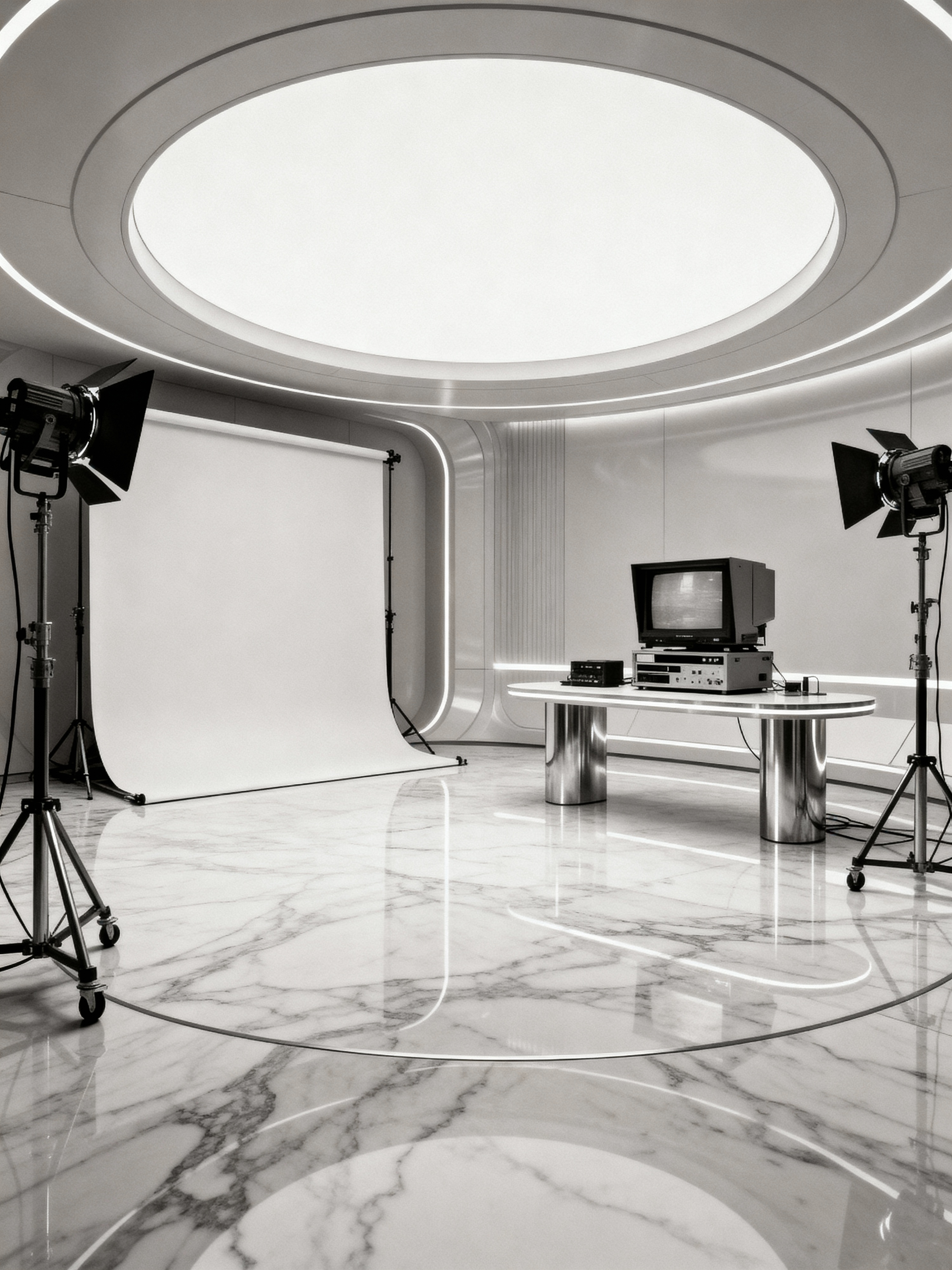 movie set with retro futuristic style with movie backdrop and film production set and director monitor and movie set and film lighting equipment and equipment table and film set interior and professional movie set. . with monochromatic palette and smooth polished marble and smooth marble and steel finishing and futuristic interior and light colors and futurism minimalist interior and circular shapes