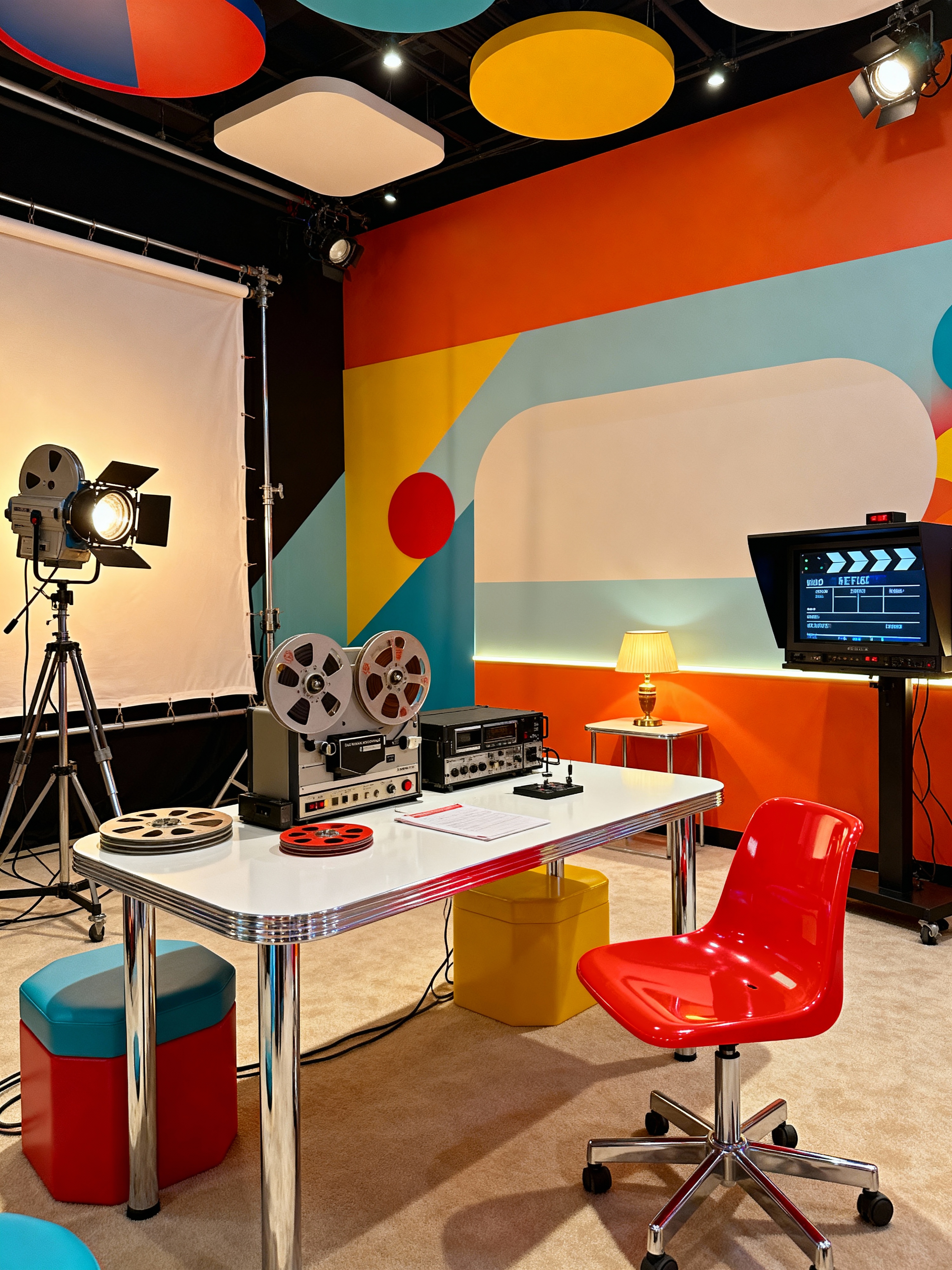 movie set with retro style with movie set and equipment table and film lighting equipment and film set interior and movie set and professional movie set and movie backdrop and director monitor. . with funky decor and vintage revival and groovy vibes and geometric shapes and bright colors and nostalgic pieces and plastic furniture and chrome accents