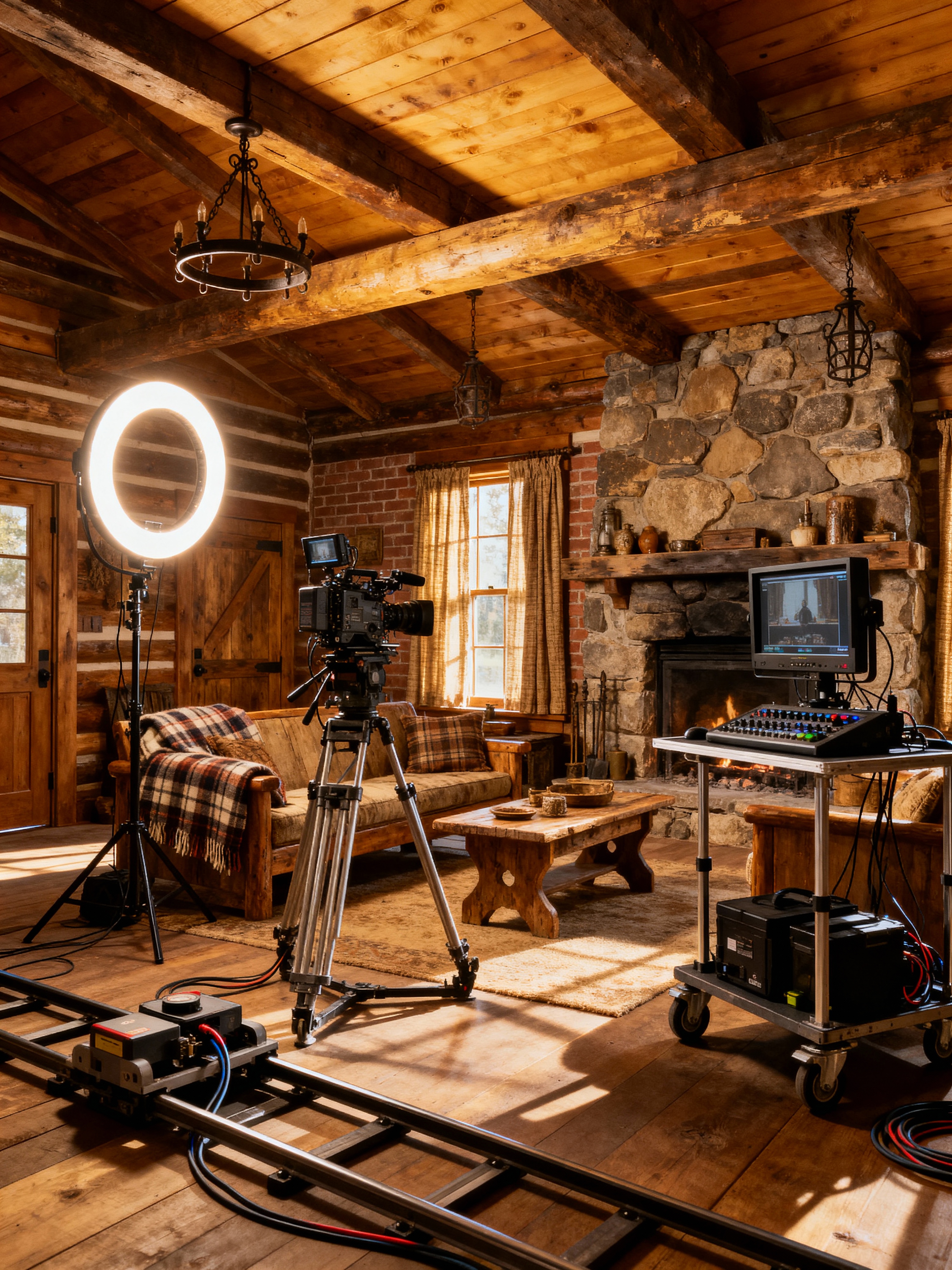 movie set with rustic style with professional movie set and ring light and camera on tripod and director monitor and professional movie set and film set interior and professional lighting equipment and equipment table. . with distressed finishes and stone accents and earthy tones and country style and cozy cabin and iron fixtures and natural wood and warmth