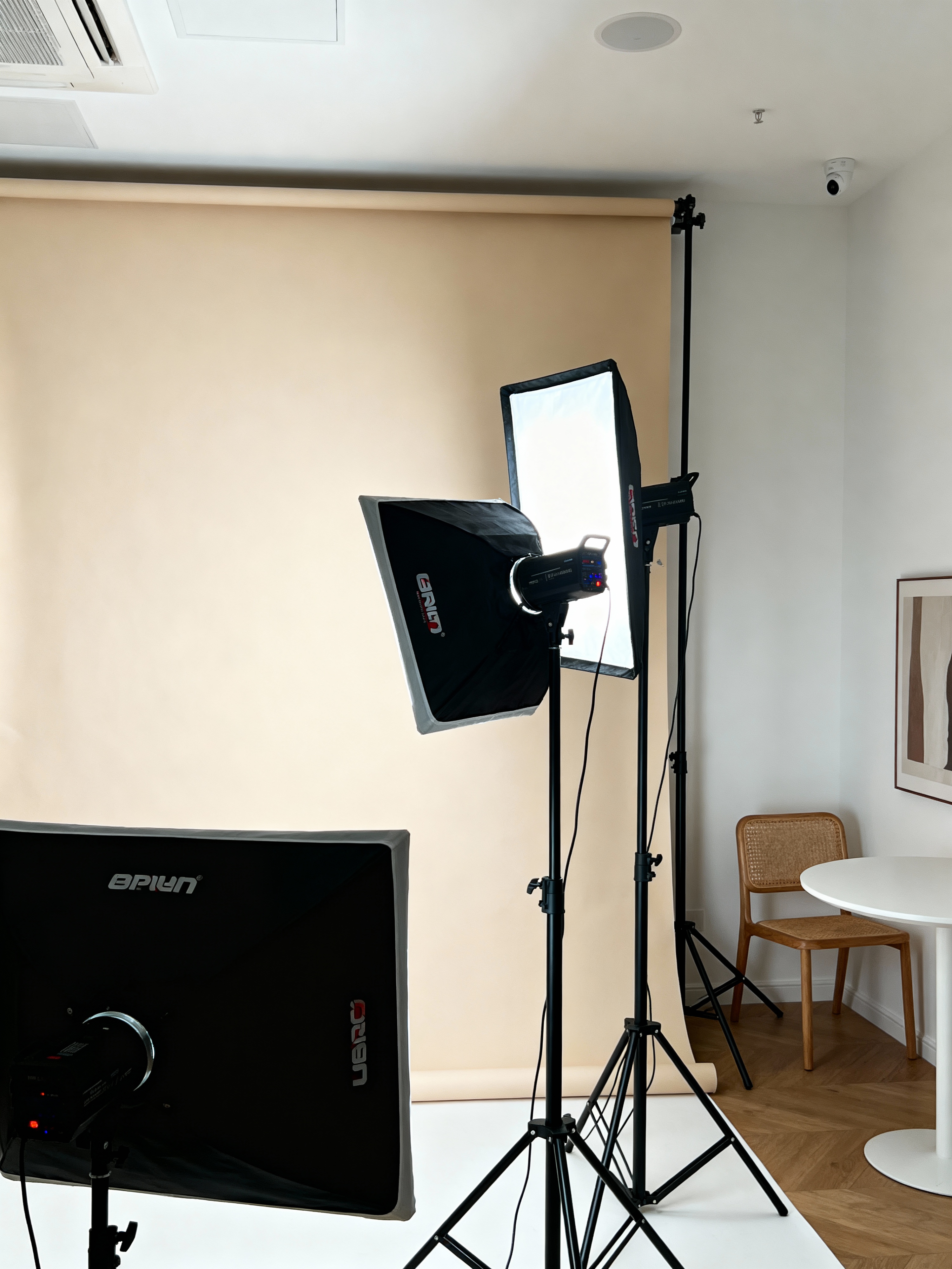 movie set with simple style with film set interior and film lighting equipment and film set interior and professional movie set and softbox lights and movie backdrop and movie set and reflector panels. . with calm atmosphere and pure simplicity and clean design and essential pieces and neutral colors and minimal decor and uncluttered space and streamlined look