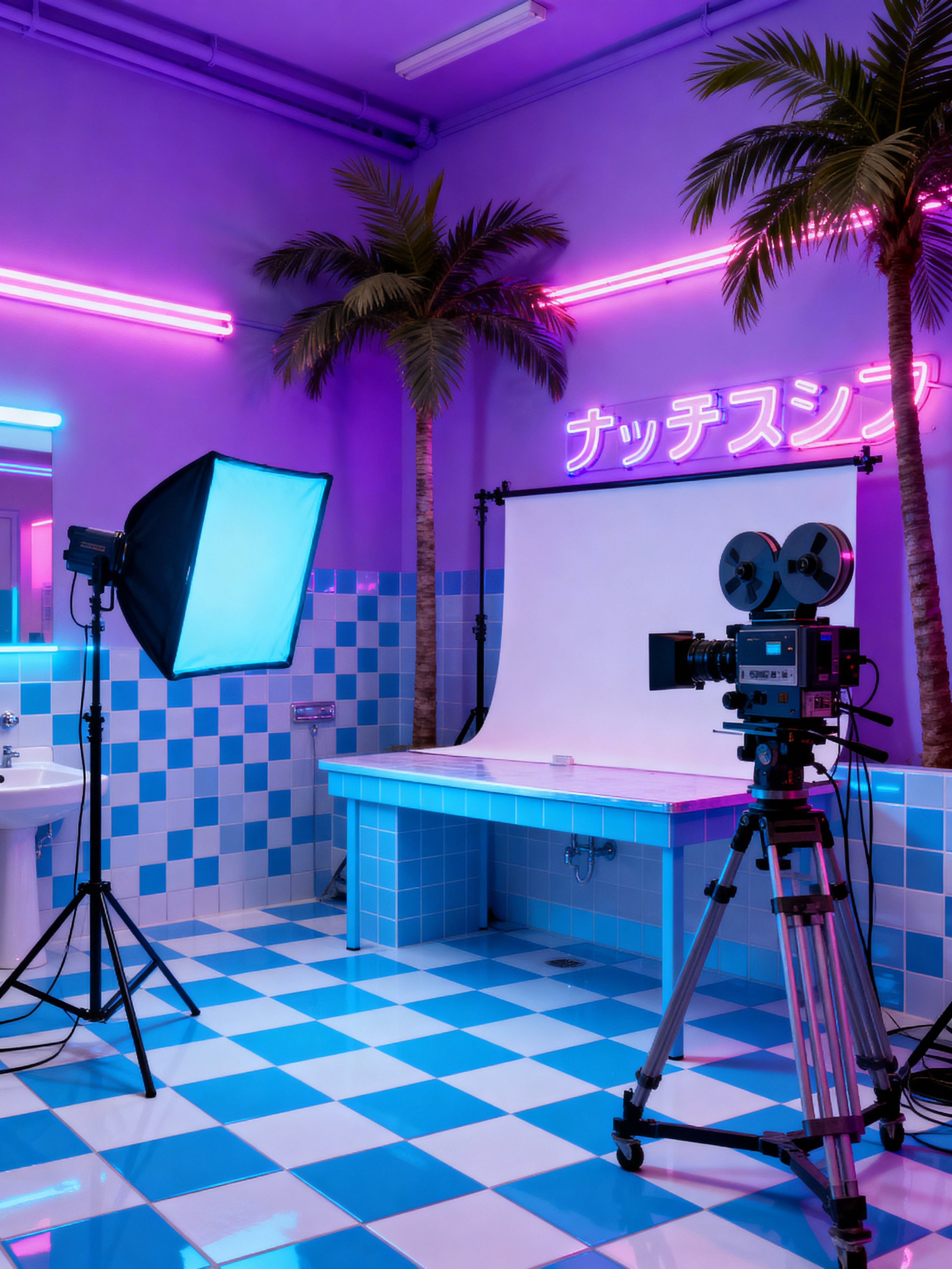 movie set with vaporwave style with movie backdrop and equipment table and cinematic lighting and reflector panels and movie set and film lighting equipment and professional movie set and camera on tripod. . with palm trees and neon glow and japanese letters on wall and purple lights and neon glow and baby blue and white square bathroom tiles and palm trees