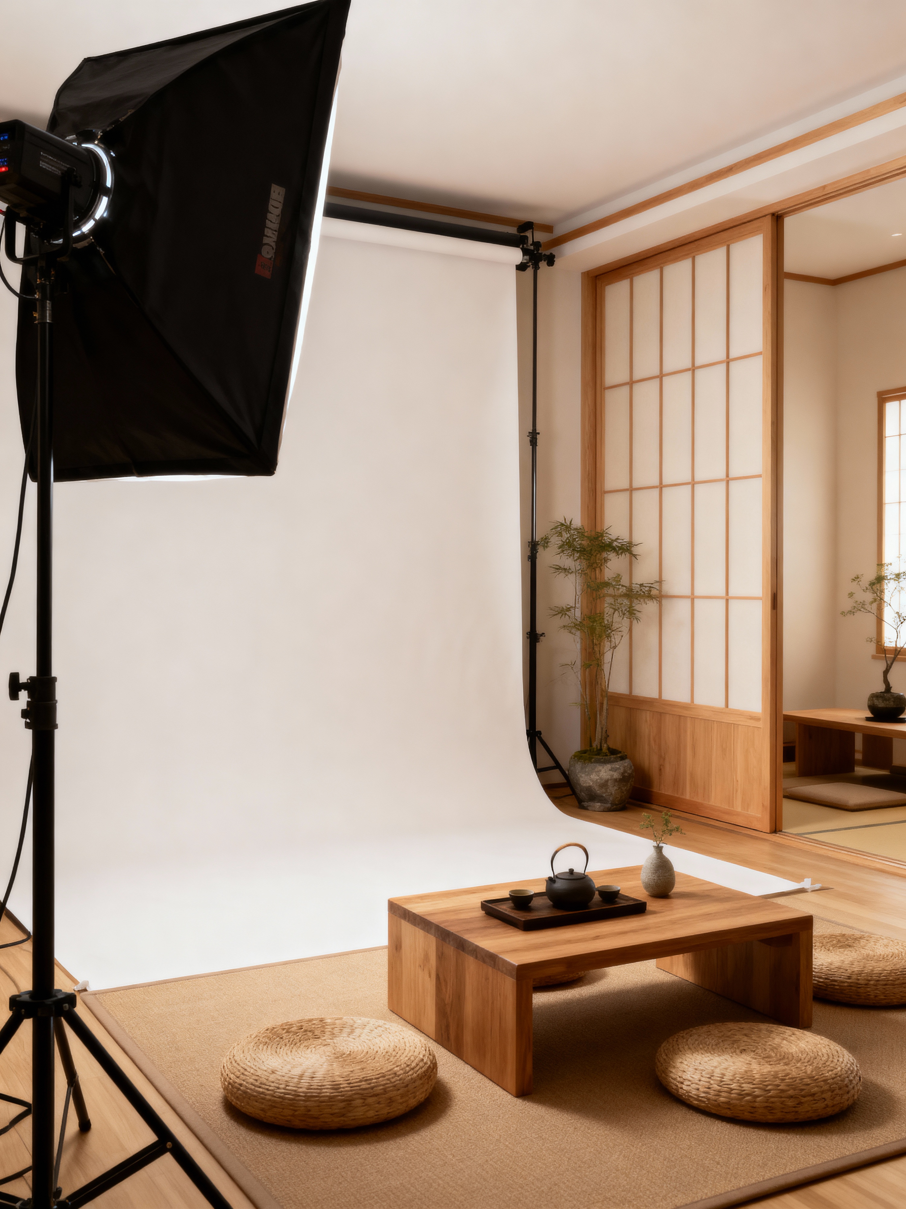 movie set with zen style with film set interior and film production set and film set interior and professional movie set and movie set and softbox lights and professional movie set and movie backdrop. . with japanese minimalist interior and simple furniture and japanese minimalist interior and natural textures and serenity and harmony and japanese minimalist interior and clutter free and asian interior