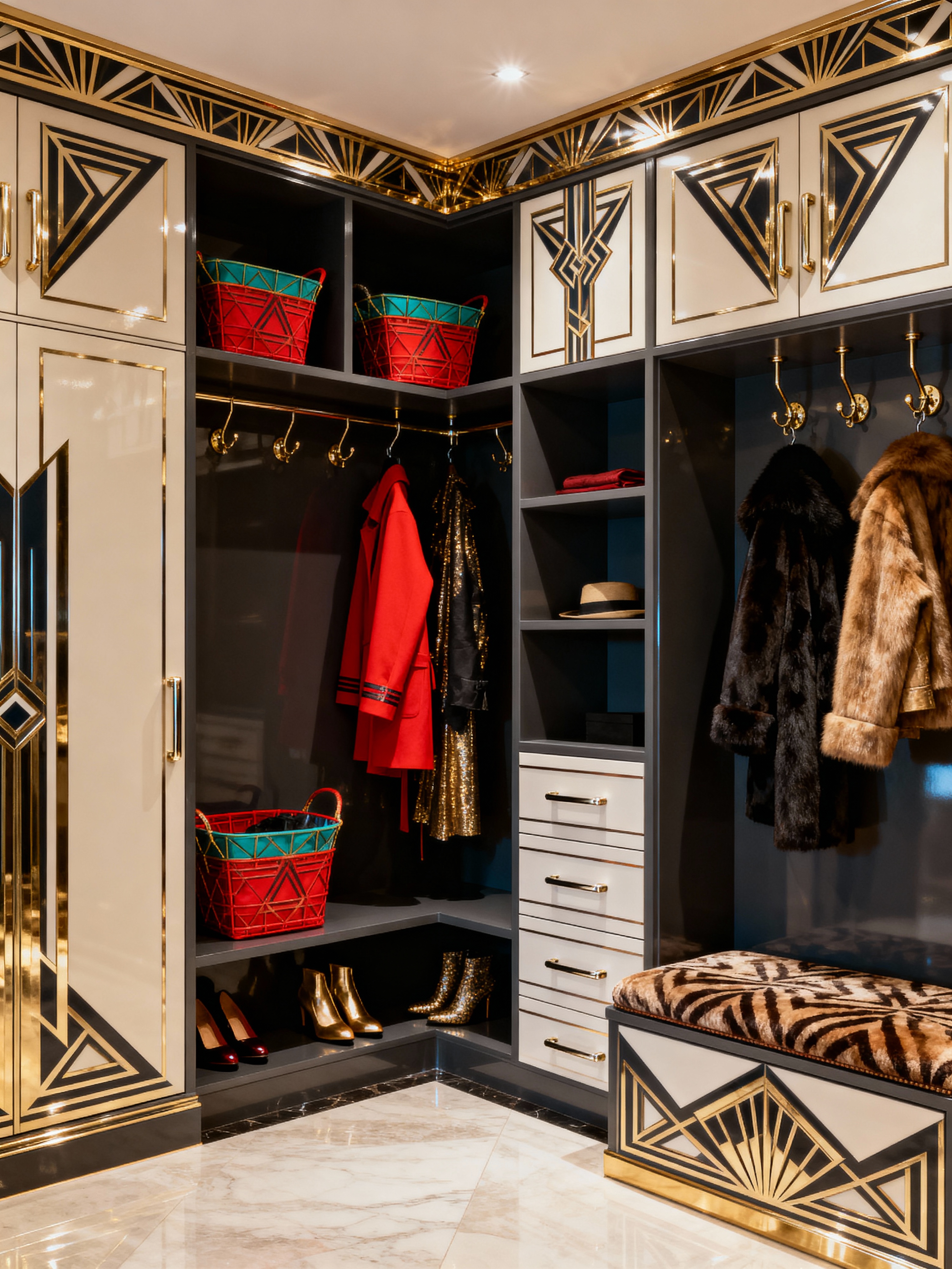 mudroom with art deco style with cabinets and wall hooks for coats and storage baskets and cubbies and shelves for shoes and storage drawers and high up storage and a bench. . with angular shapes and decadent detail and glamour and geometric lines and rich colors and bold geometry and luxury and stream-lined forms