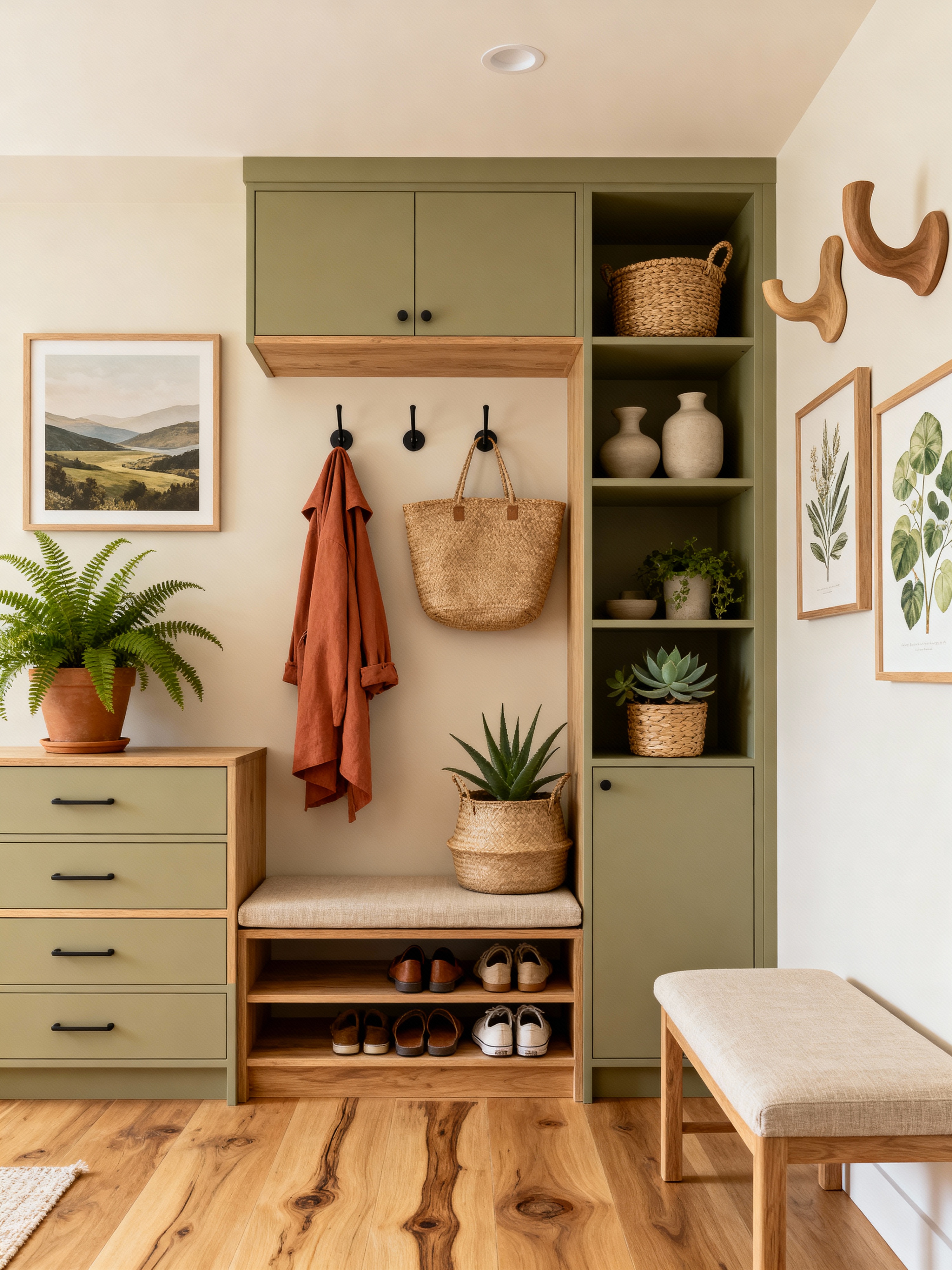 mudroom with biophilic style with storage drawers and wall hooks for coats and storage baskets and a bench and shelves for shoes and cabinets and high up storage and cubbies. . with natural shapes and forms and natural environment and images of nature and wood materials and calming style and plants and linen materials and earthy colors