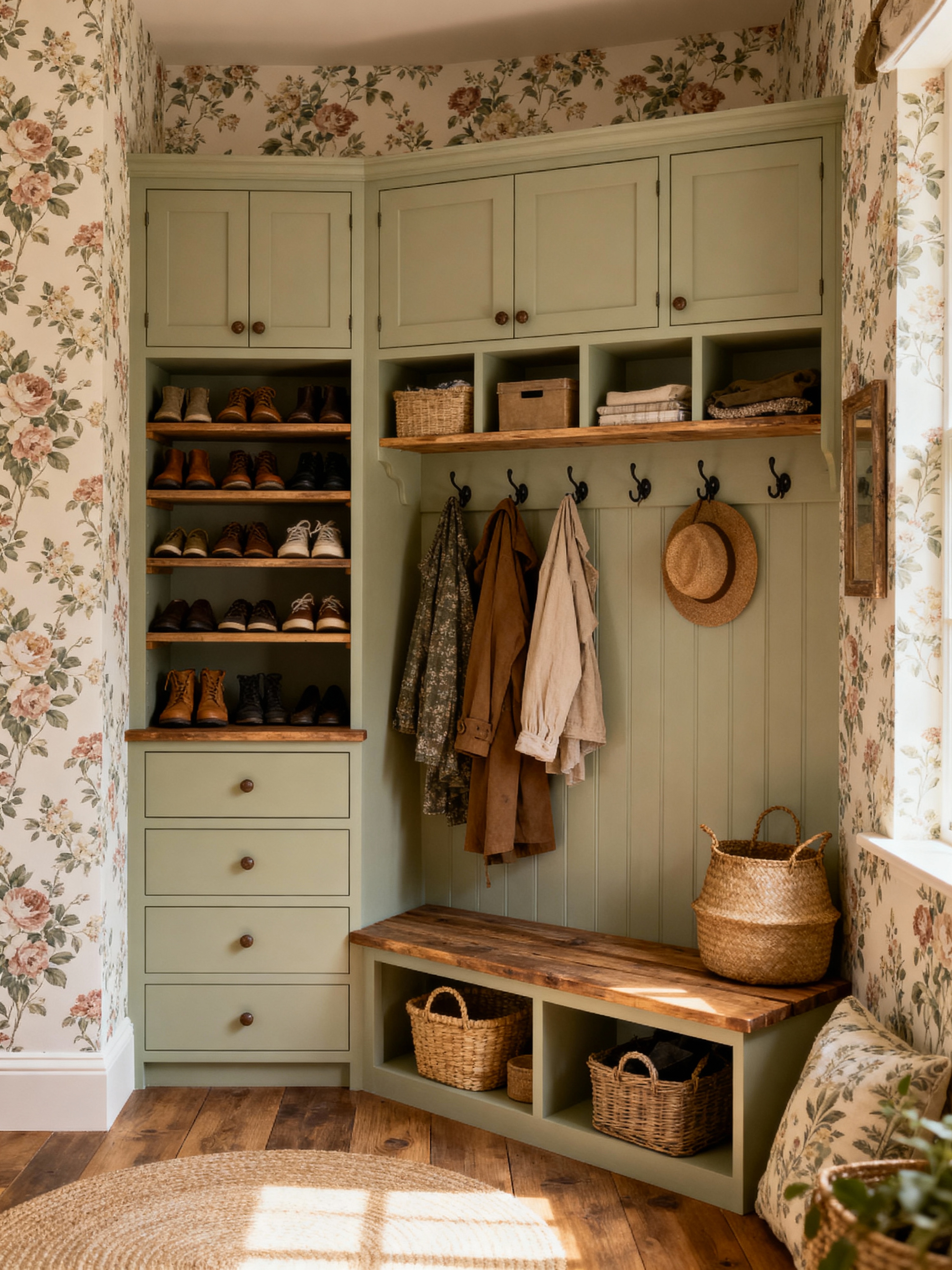 mudroom with cottagecore style with shelves for shoes and high up storage and storage drawers and cubbies and a bench and wall hooks for coats and cabinets and storage baskets. . with natural and traditional and floral patterns and earthy and country style and muted colors and rustic and cottage style