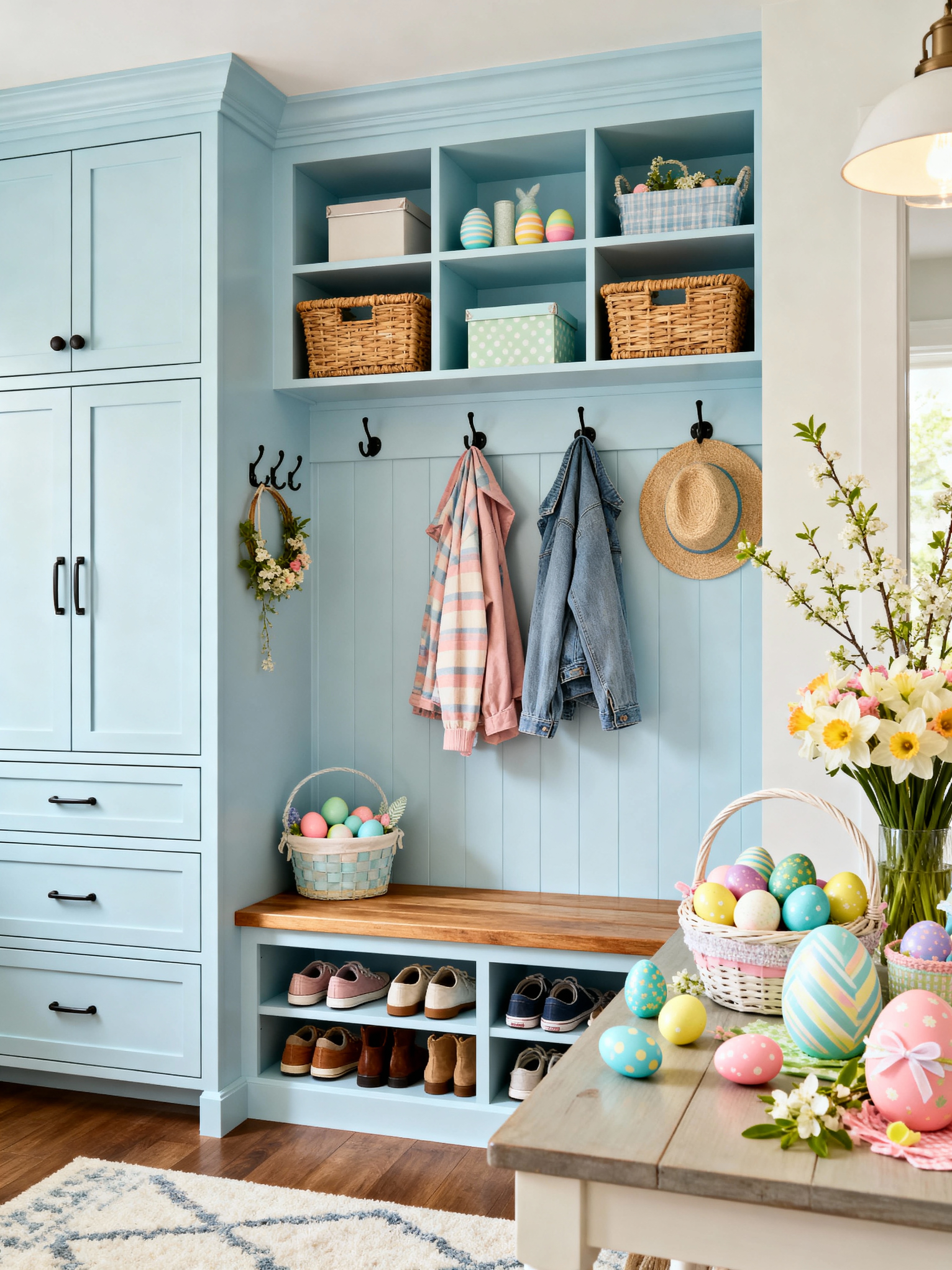 mudroom with easter style with a bench and cabinets and storage baskets and wall hooks for coats and storage drawers and shelves for shoes and high up storage and cubbies. . with light blue colors and easter decorations and flowers on table and colorful easter eggs and spring decorations and light blue colors