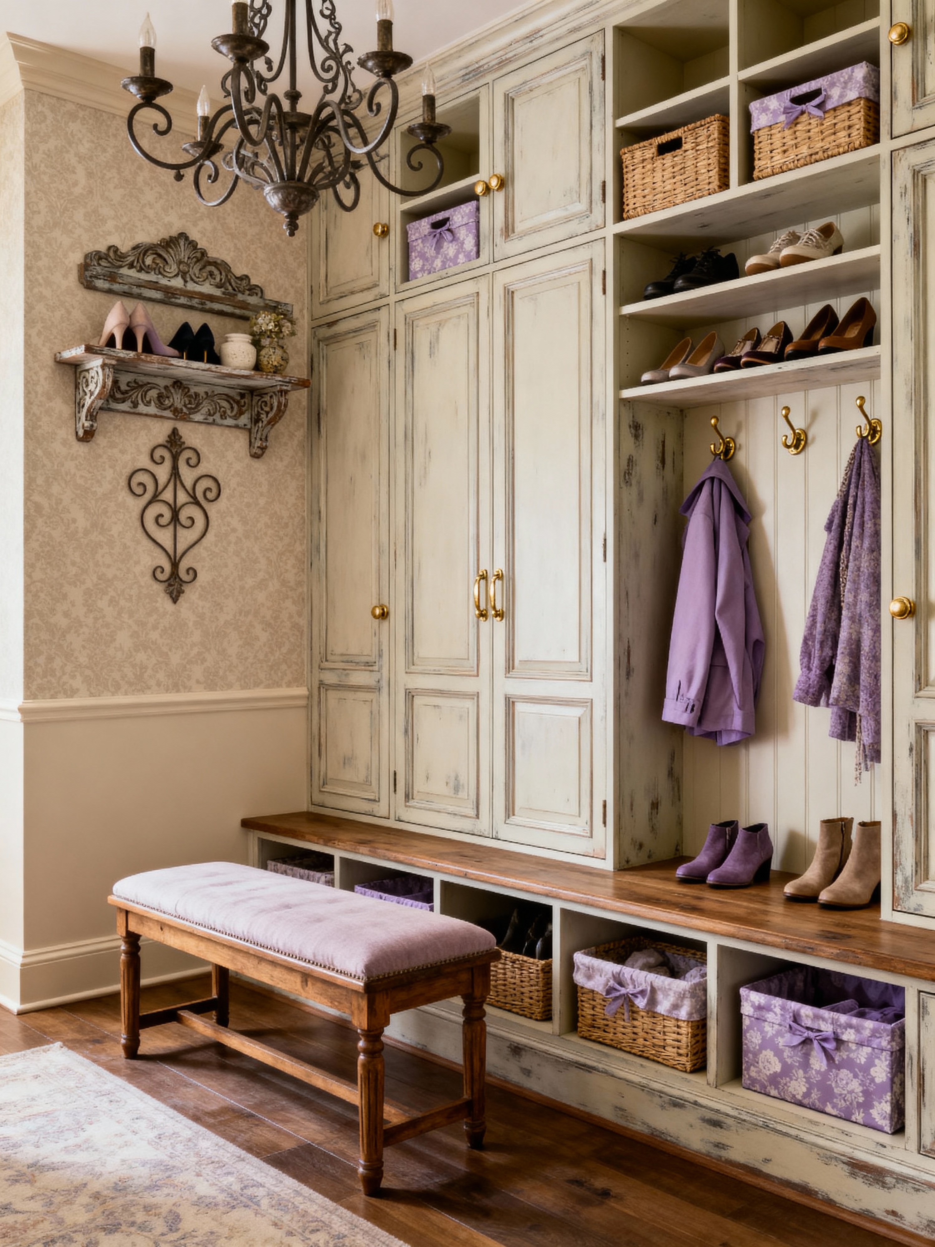mudroom with french country style with a bench and cabinets and high up storage and storage baskets and shelves for shoes and cubbies and storage drawers and wall hooks for coats. . with chandeliers and warm tones and textured walls and country elegance and ornate details and elegant rustic and distressed wood and lavender accents