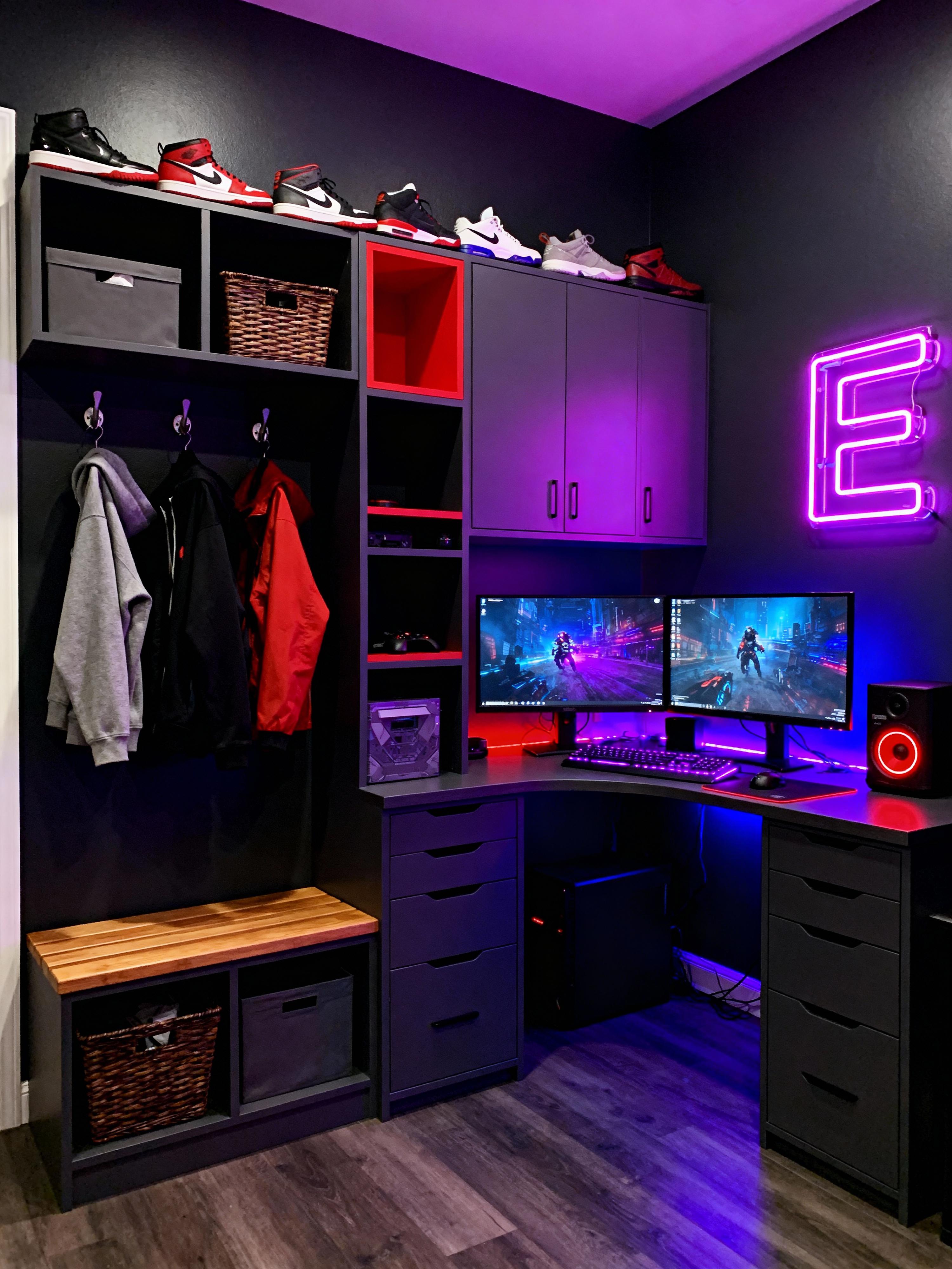 mudroom with gaming room style with high up storage and shelves for shoes and wall hooks for coats and cubbies and storage baskets and cabinets and storage drawers and a bench. . with neon letters on wall and purple, red and blue fade light and dark lit room and at night and dark walls and computer desk with computer displays and keyboard and purple and red lights and speakers