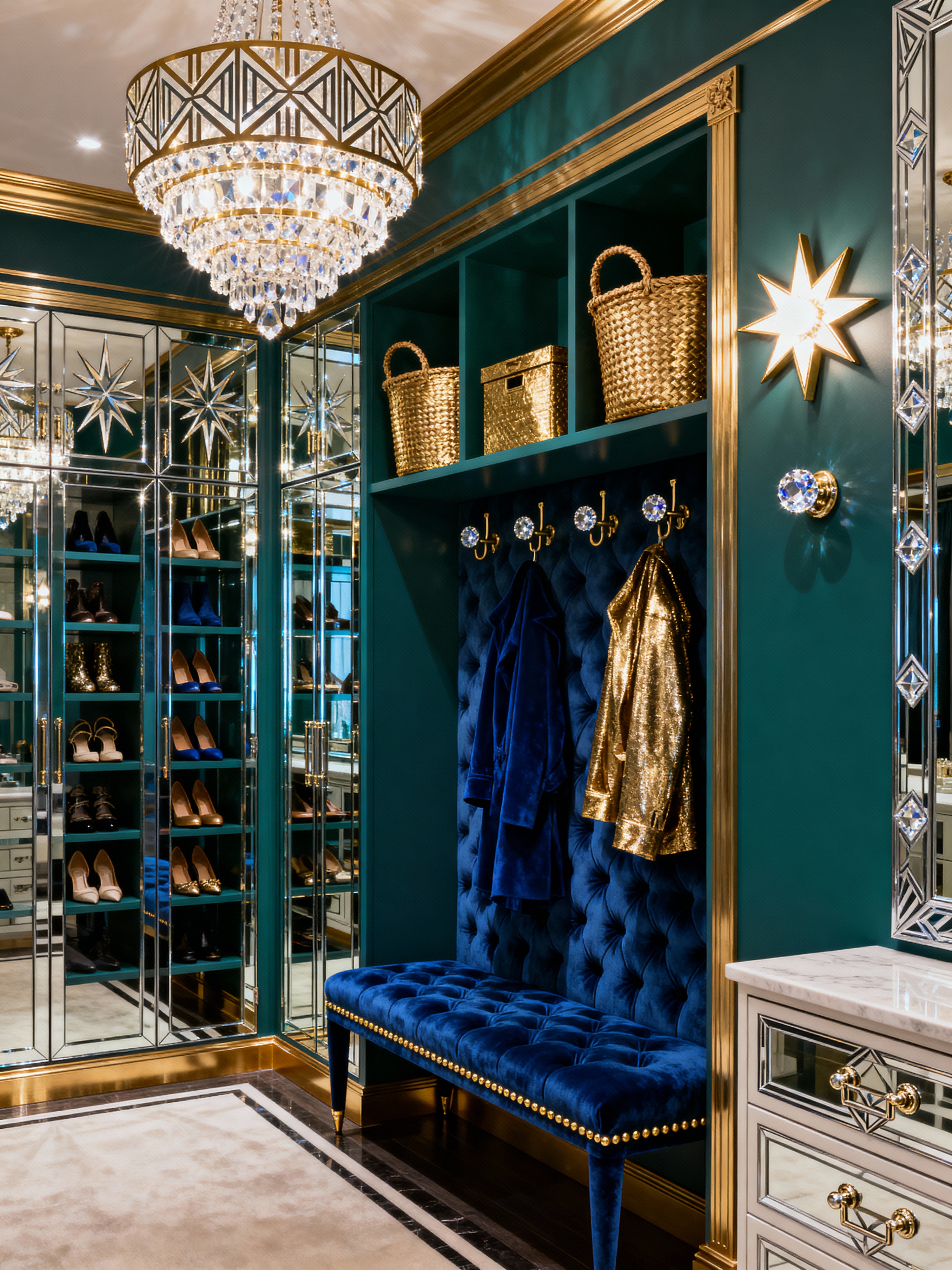 mudroom with hollywood glam style with shelves for shoes and a bench and high up storage and storage baskets and wall hooks for coats and storage drawers and cubbies and cabinets. . with crystal chandeliers and art deco influence and star quality and opulent details and bold colors and metallic accents and glamorous style and dramatic lighting
