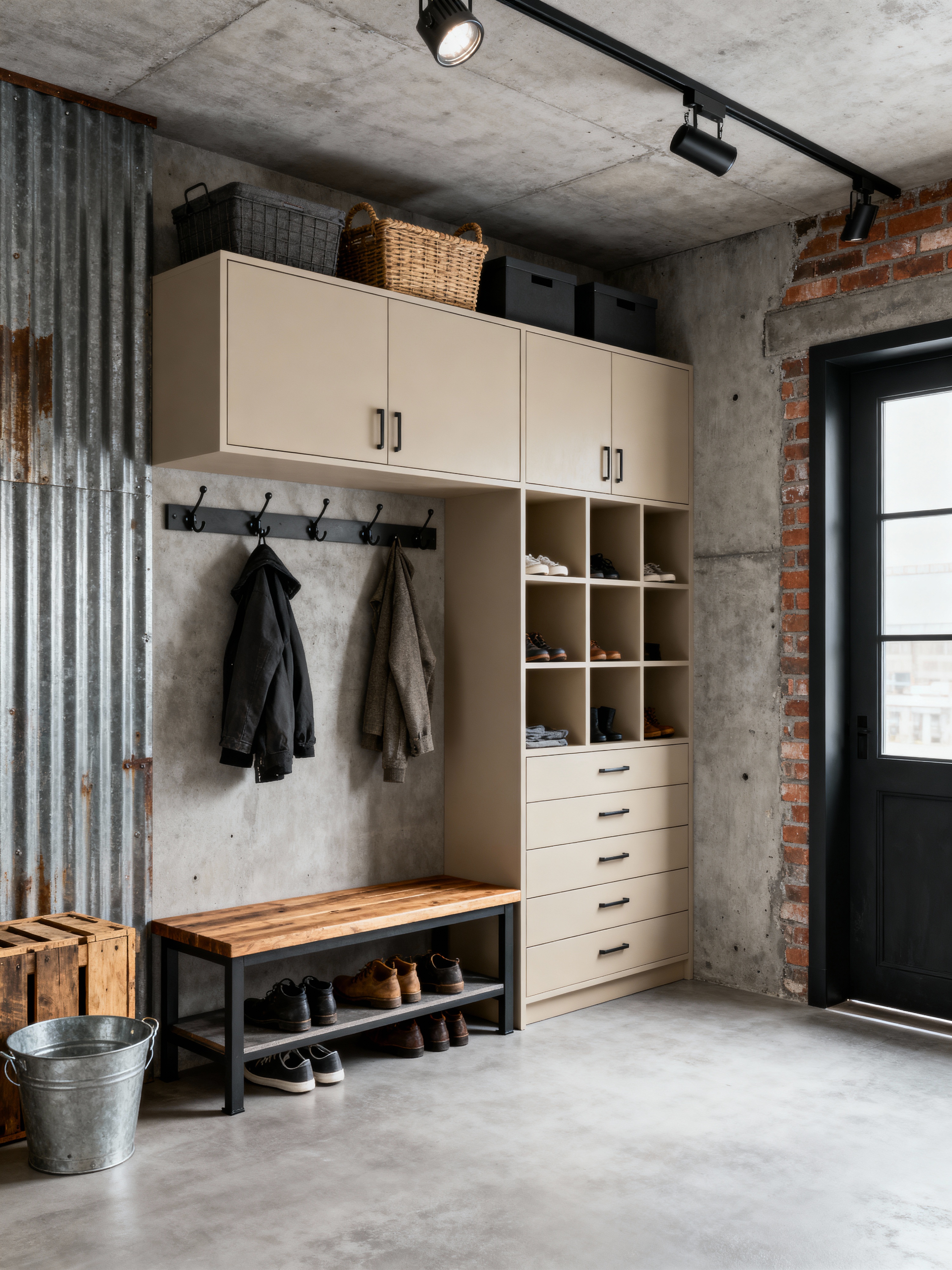 mudroom with industrial style with high up storage and storage baskets and a bench and storage drawers and wall hooks for coats and shelves for shoes and cabinets and cubbies. . with exposed concrete and exposed brick and metal panels and neutral tones and utilitarian objects and factory style and reclaimed wood and open floorplan