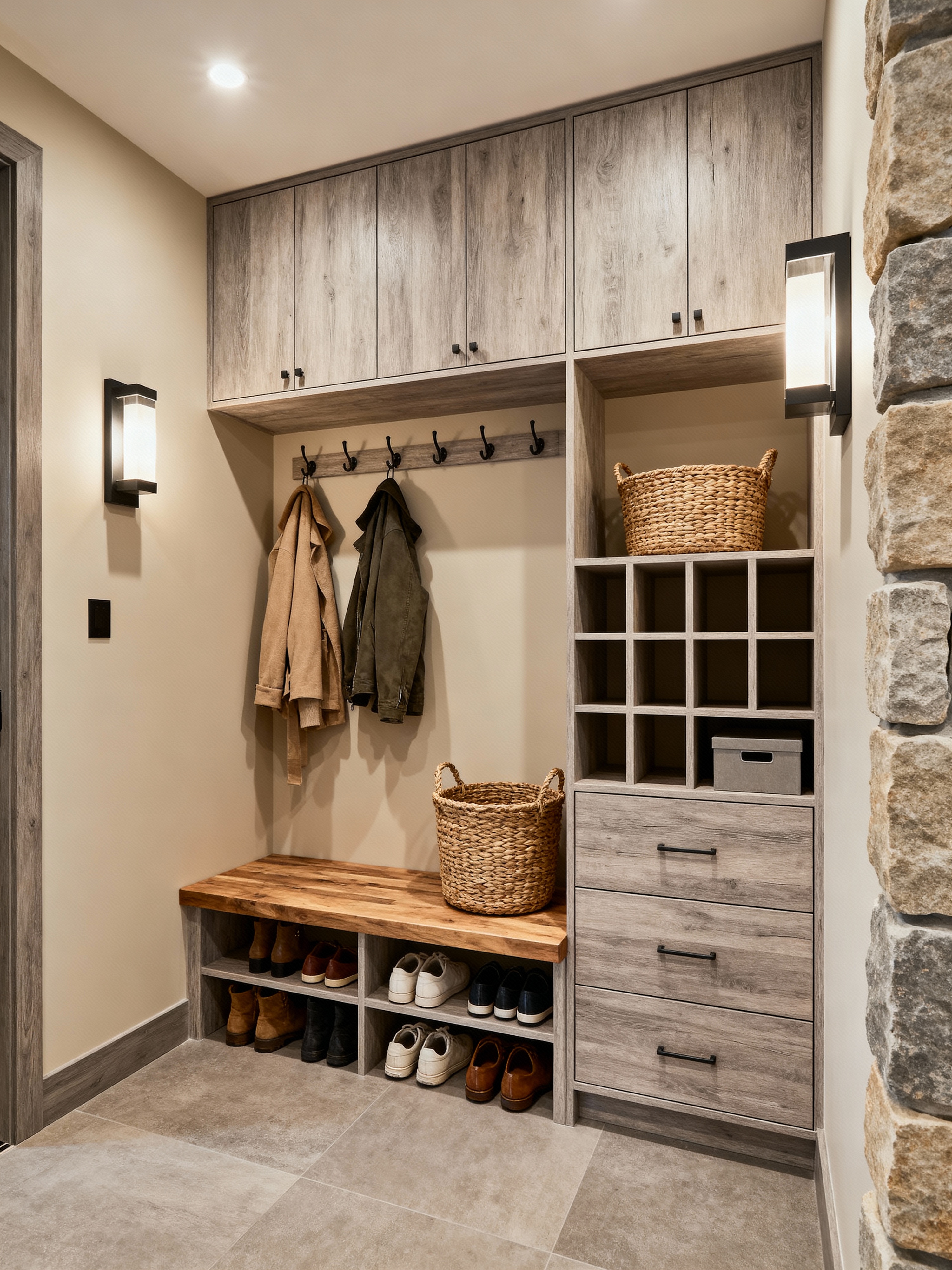 mudroom with modern style with high up storage and a bench and wall hooks for coats and storage baskets and shelves for shoes and storage drawers and cabinets and cubbies. . with natural materials and elements and neutral walls and textures and simple, clean lines and simplistic furniture and open and natural lighting and practicality and functionality and natural materials and elements