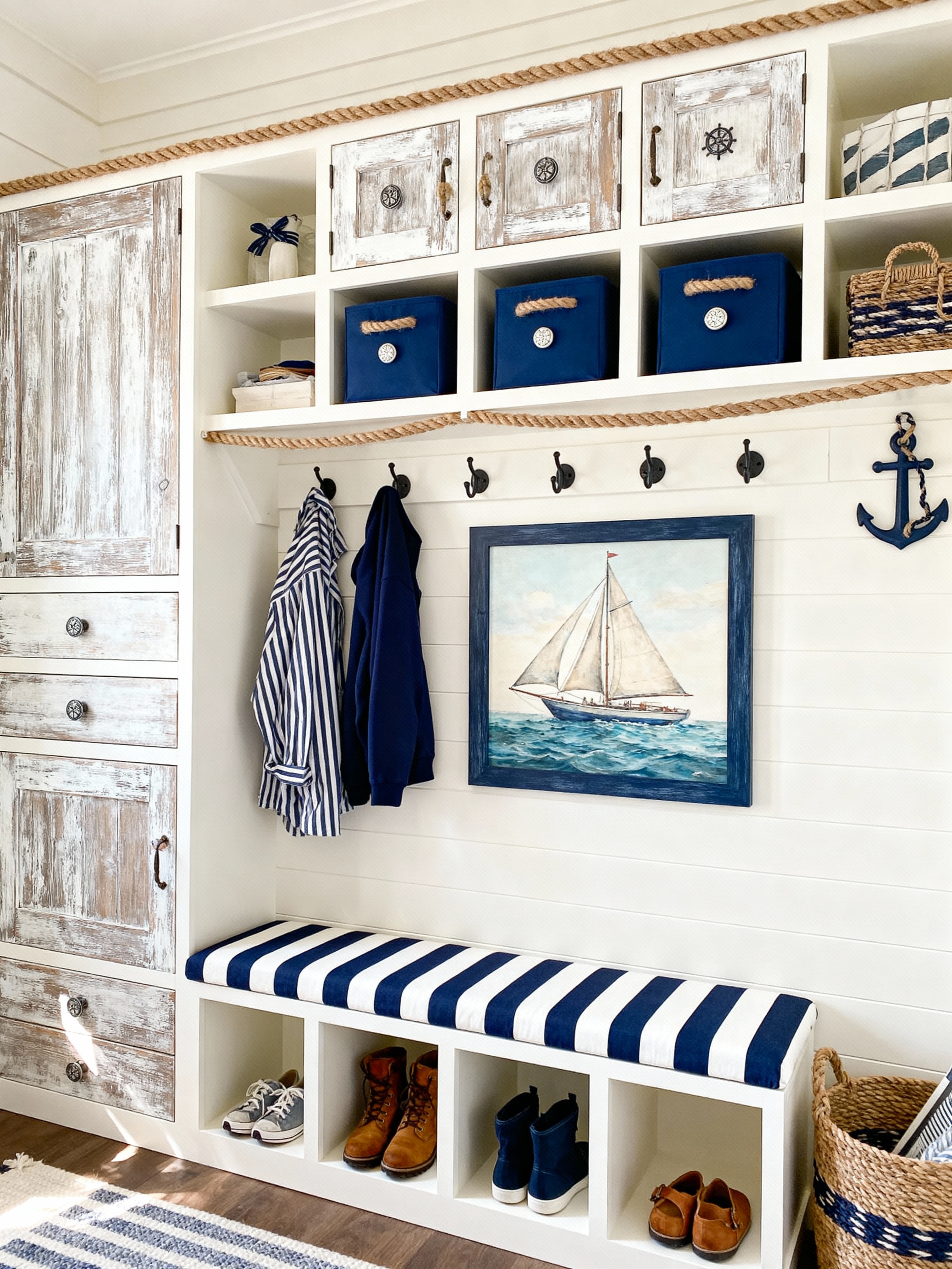 mudroom with nautical style with shelves for shoes and cabinets and storage drawers and high up storage and wall hooks for coats and a bench and cubbies and storage baskets. . with coastal vibes and rope details and navy blue and crisp white and weathered wood and striped patterns and sailboat elements and ocean inspiration