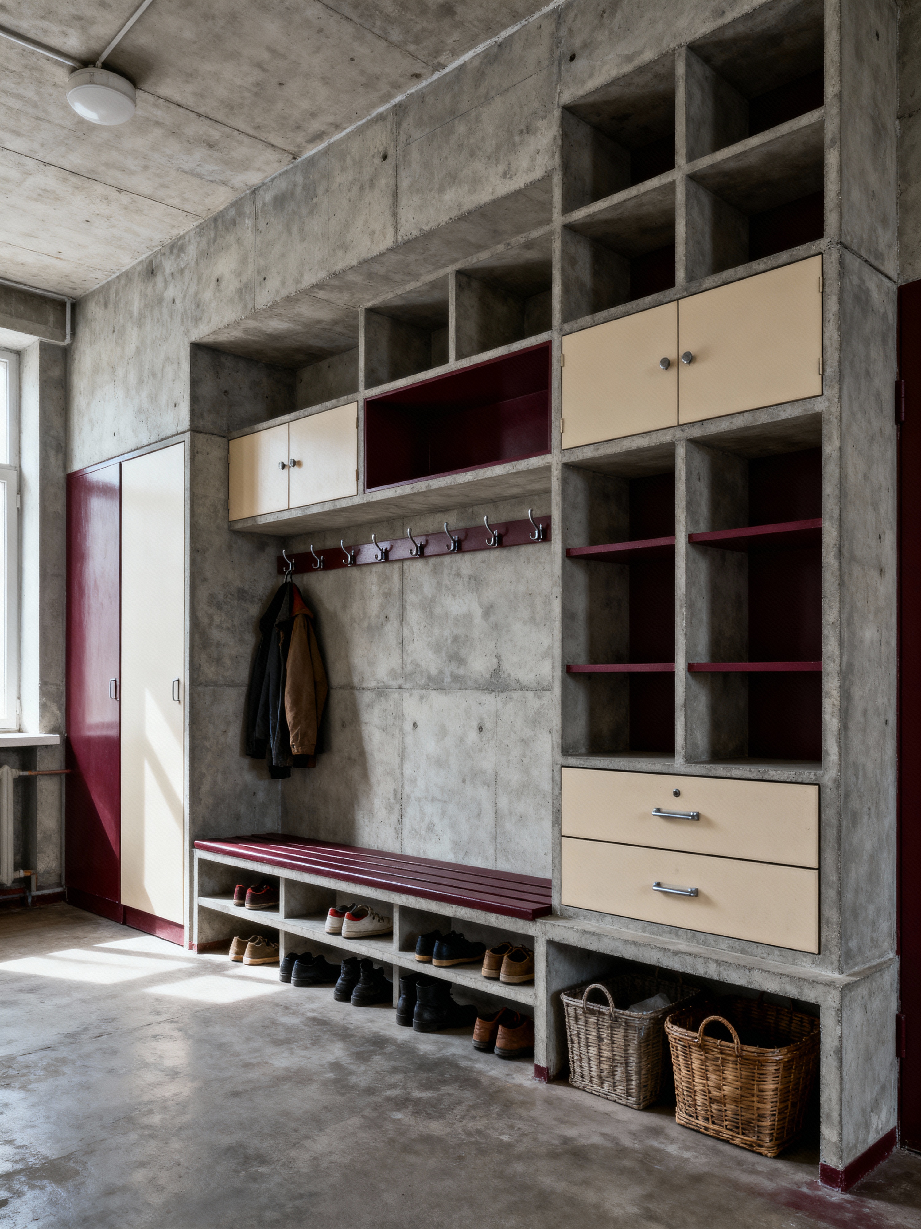 mudroom with soviet style with high up storage and cubbies and cabinets and a bench and shelves for shoes and wall hooks for coats and storage drawers and storage baskets. . with concrete structures and monumental scale and eastern bloc and brutalist style and utilitarian design and communist design and austere aesthetic and institutional look
