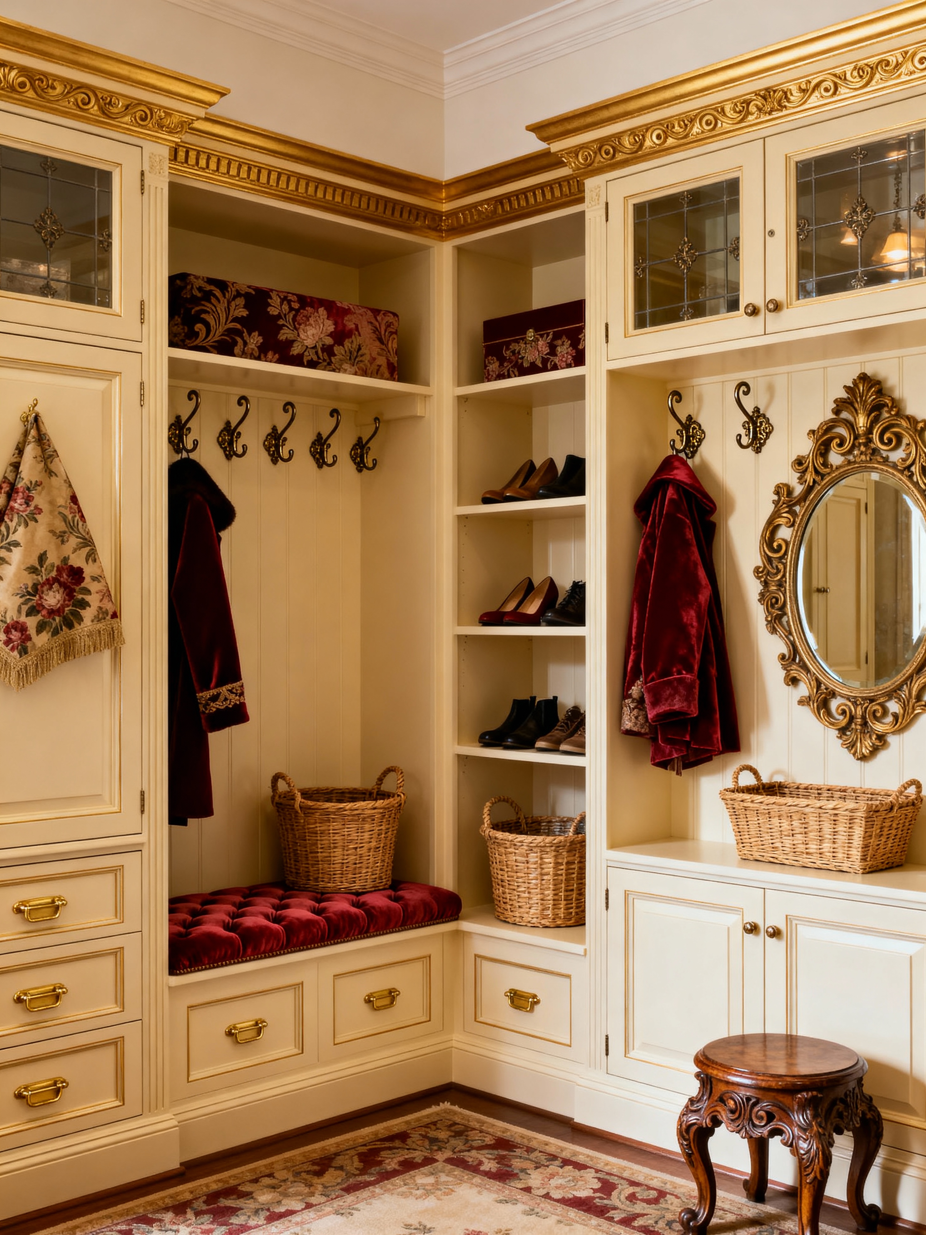 mudroom with traditional style with cubbies and storage drawers and a bench and storage baskets and wall hooks for coats and shelves for shoes and cabinets and high up storage. . with classic elegance and luxurious textiles and symmetrical layout and timeless design and ornate details and warm colors and antique pieces and crown molding