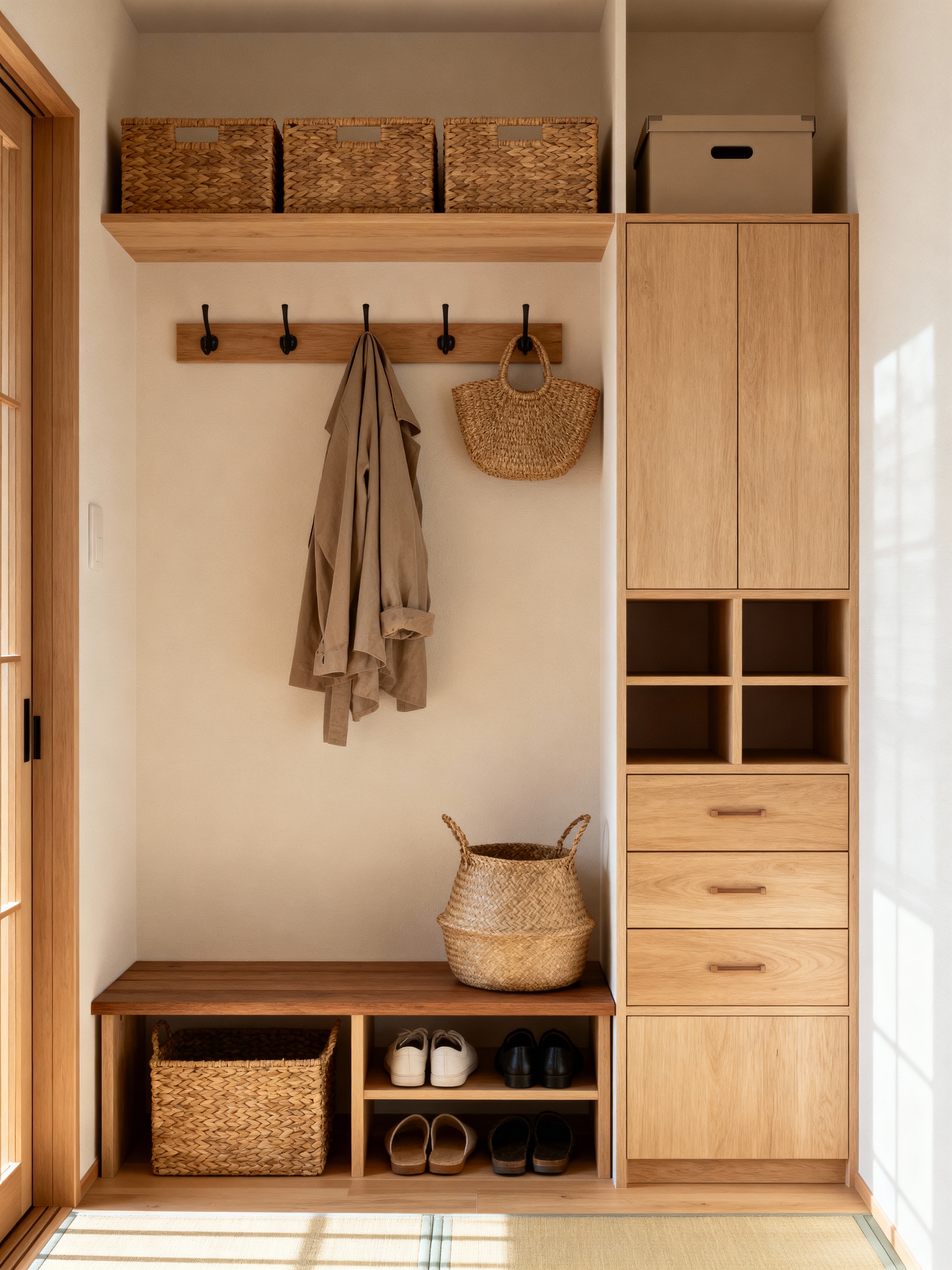 mudroom with zen style with wall hooks for coats and a bench and storage baskets and cabinets and storage drawers and shelves for shoes and cubbies and high up storage. . with simple furniture and clutter free and natural textures and japanese minimalist interior and simplicity and asian interior and mimimalist and natural light