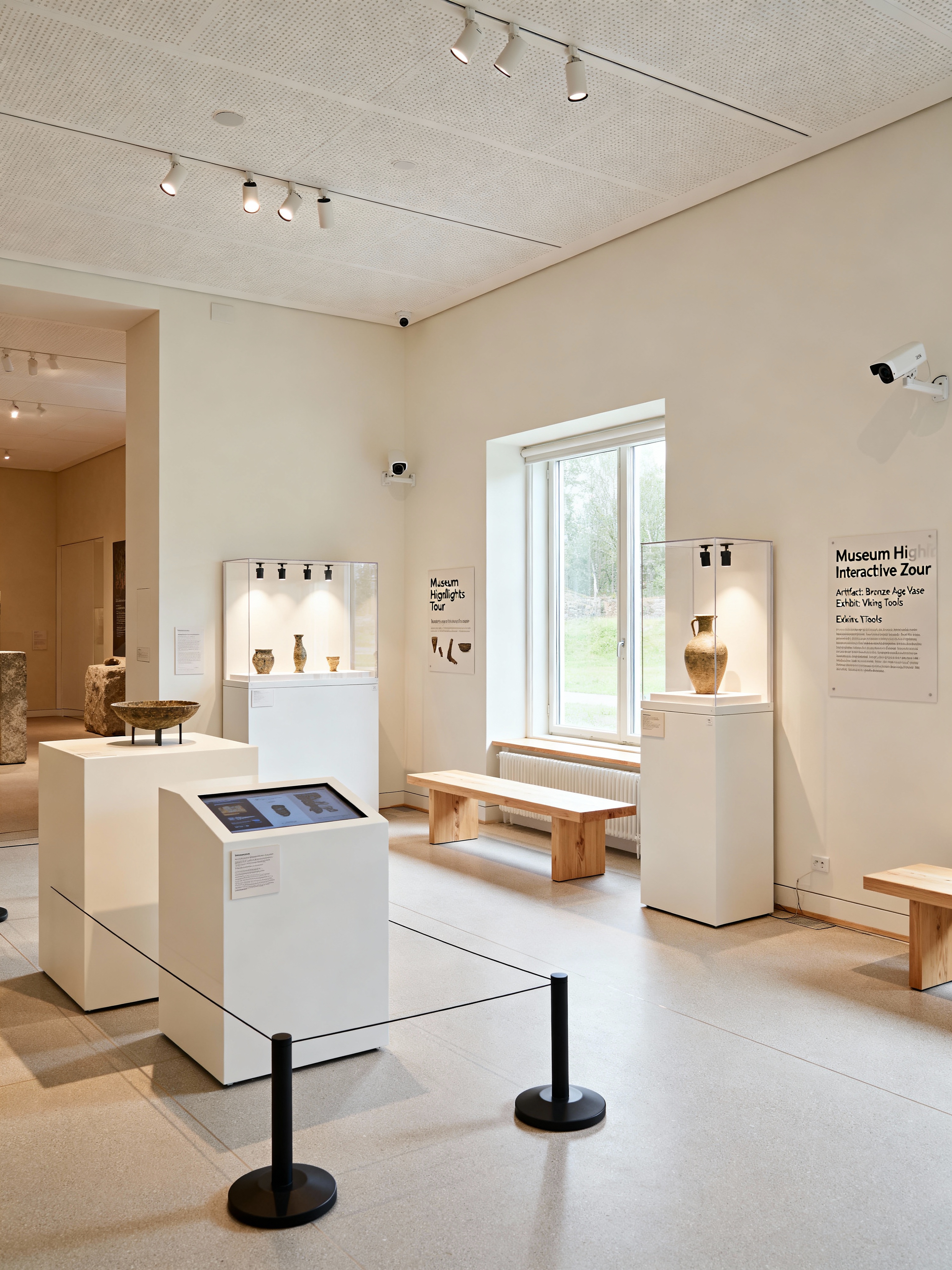 museum hall with airbnb style with pedestals and interactive displays and security cameras and guided tour signs and artifacts and spotlights and barriers and information plaques. . with scandinavian style and simple, clean lines and simplistic furniture and open and natural lighting and natural materials and elements and practicality and functionality and simple color palette and neutral walls and textures and scandinavian style