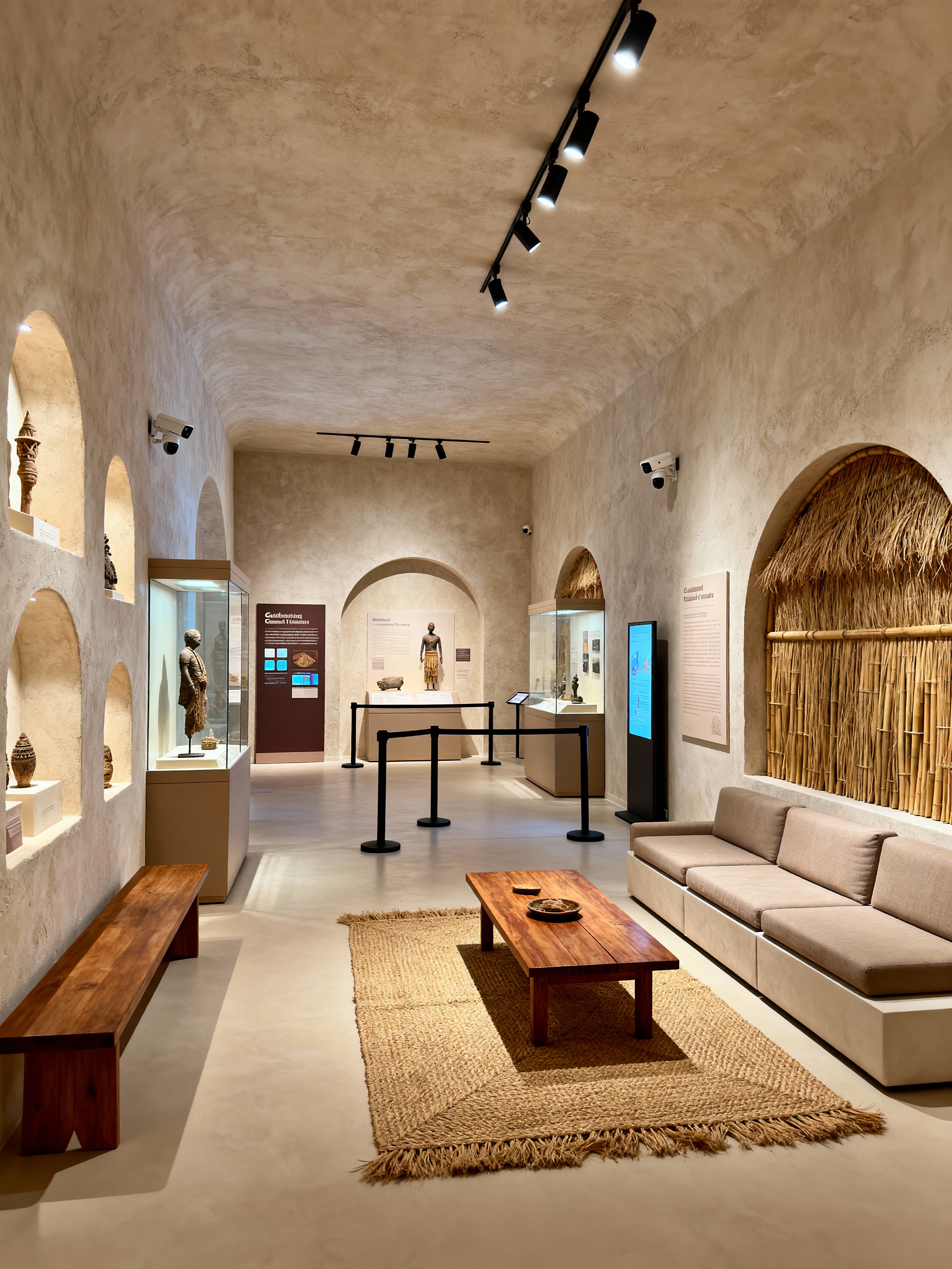 museum hall with bali style with spotlights and barriers and interactive displays and benches and security cameras and display cases and guided tour signs and artifacts. . with modern boho chic and arched walls and niches and raffia or bamboo accents and neutral color palette and low modular sofas and textured plaster or stucco finish and wooden coffee and dining tables and woven rugs (jute, seagrass)