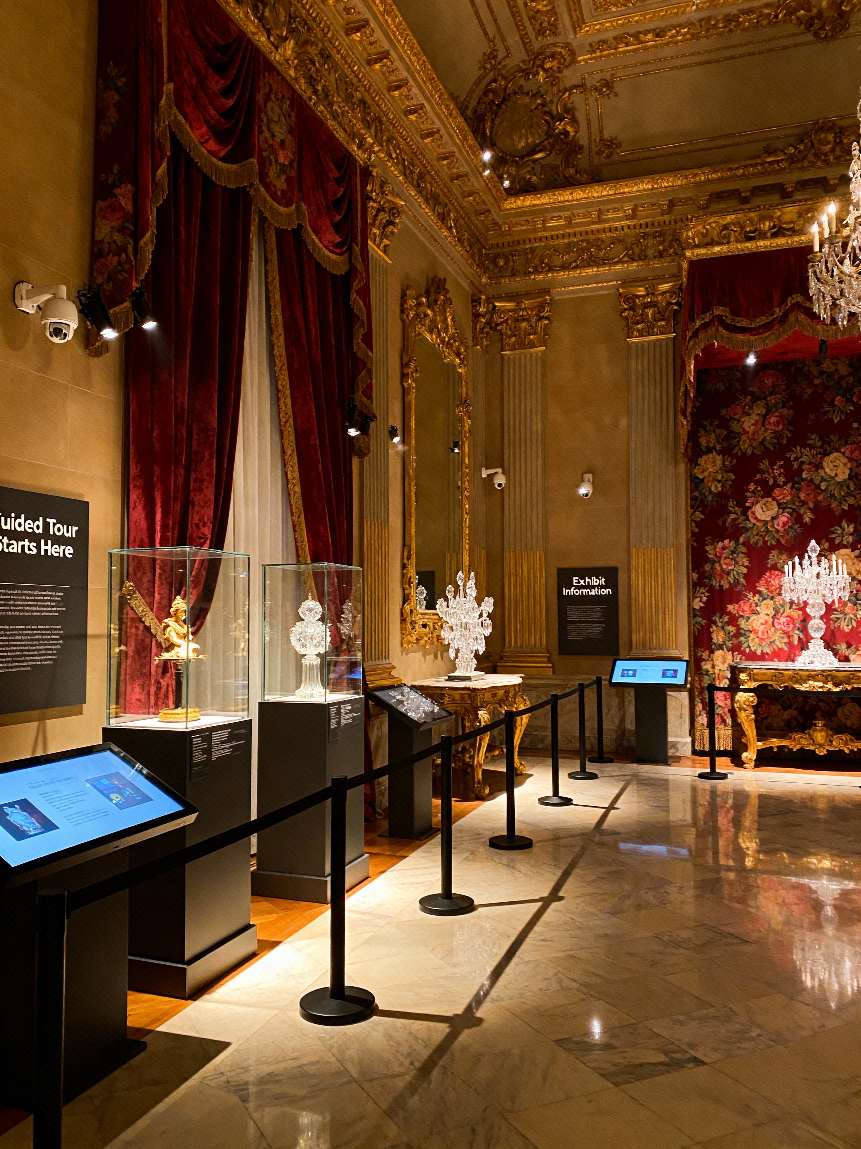 museum hall with baroque style with spotlights and barriers and pedestals and guided tour signs and display cases and interactive displays and information plaques and security cameras. . with sensuous richness and elaborate ornamentation and tension and drama and luxurious floral and damask fabrics and movement and crystal and glass accents and opulent and colossal furniture