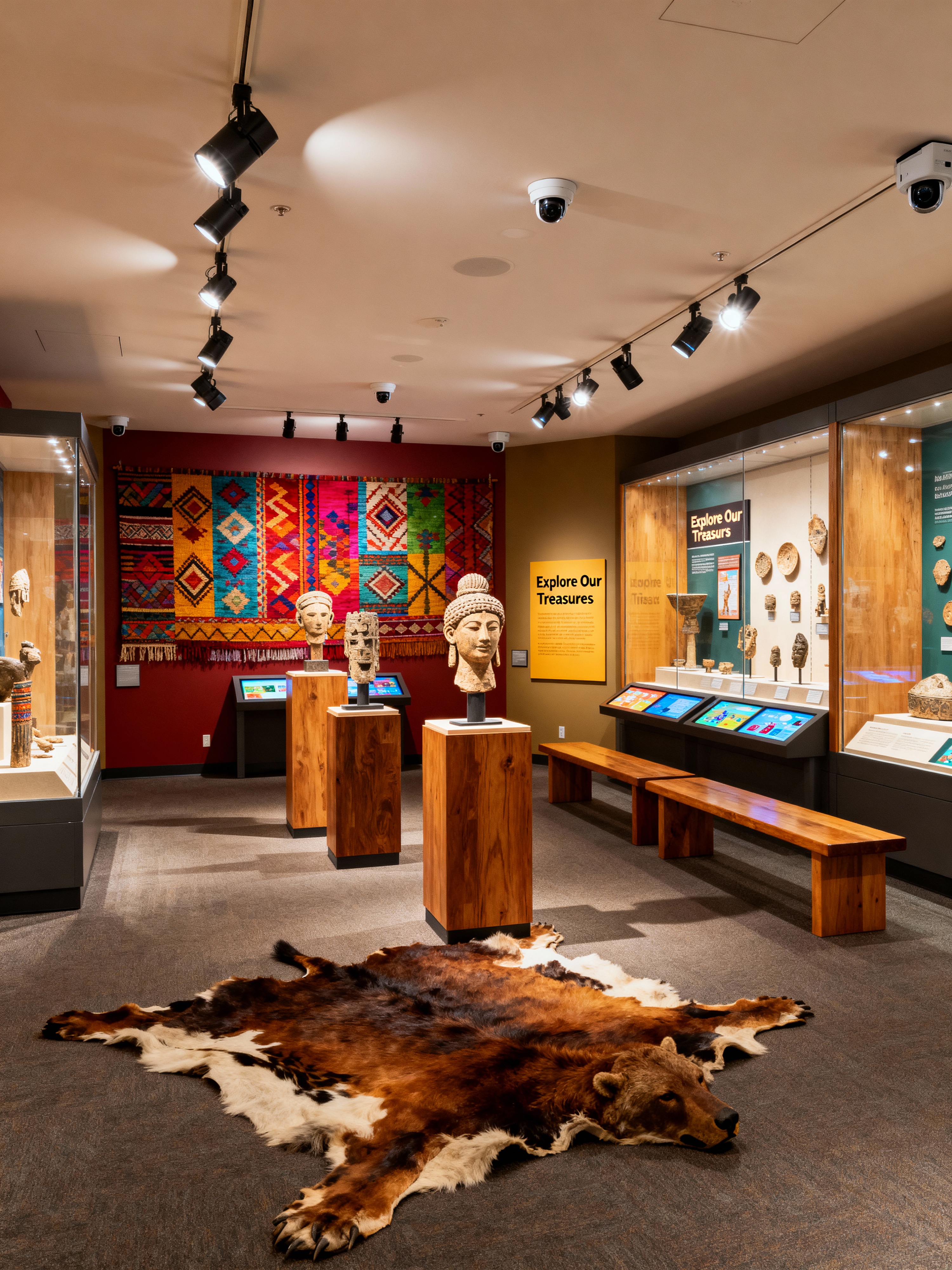 museum hall with bohemian style with pedestals and guided tour signs and display cases and interactive displays and benches and security cameras and spotlights and artifacts. . with bold colors and playful textures and playful colors and mixed patterns and carefree layers of pattern, texture, and color and woods and animal hides and natural materials
