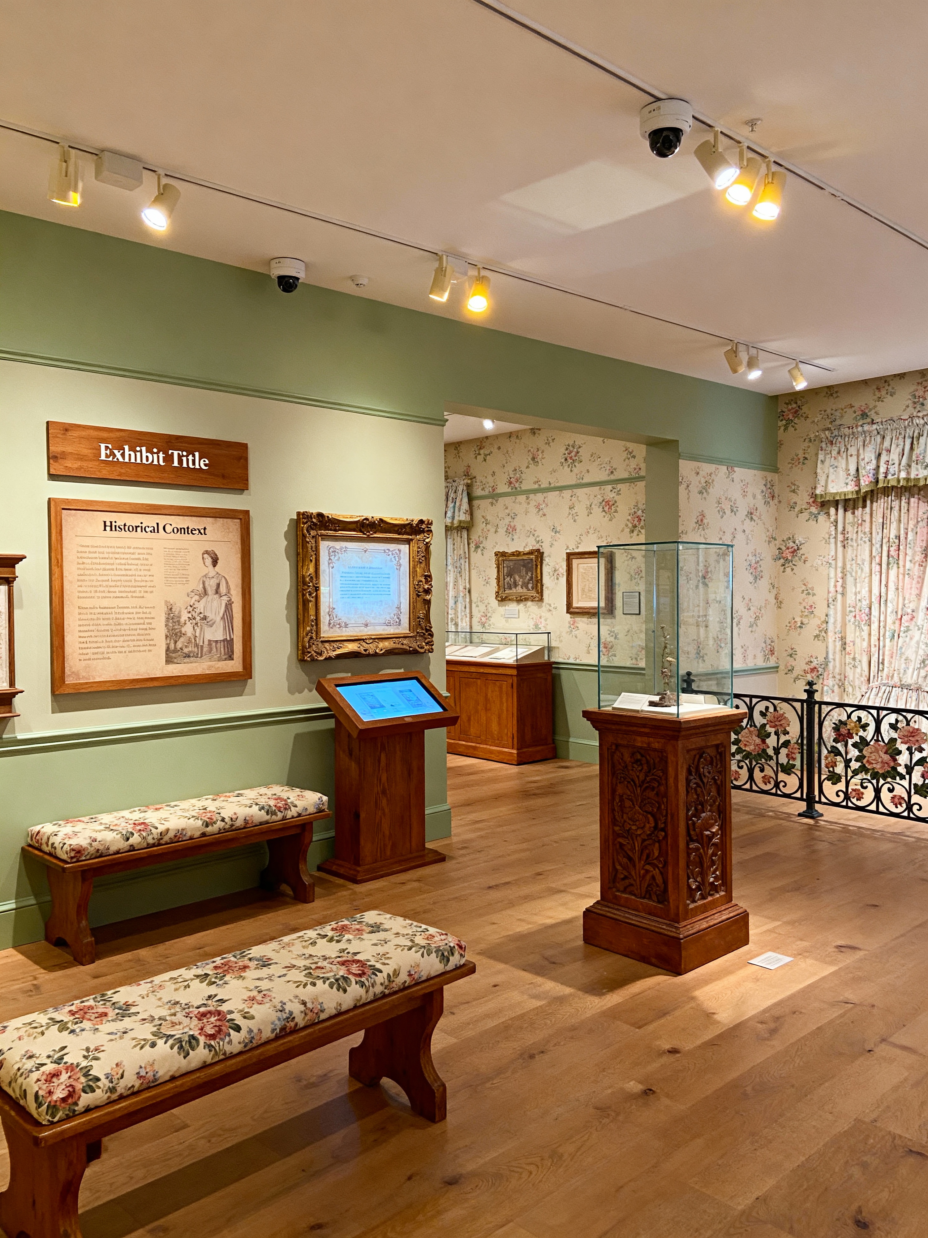 museum hall with cottagecore style with information plaques and security cameras and benches and spotlights and interactive displays and display cases and pedestals and barriers. . with rustic and floral patterns and traditional and muted colors and earthy and organic and country style and cottage style