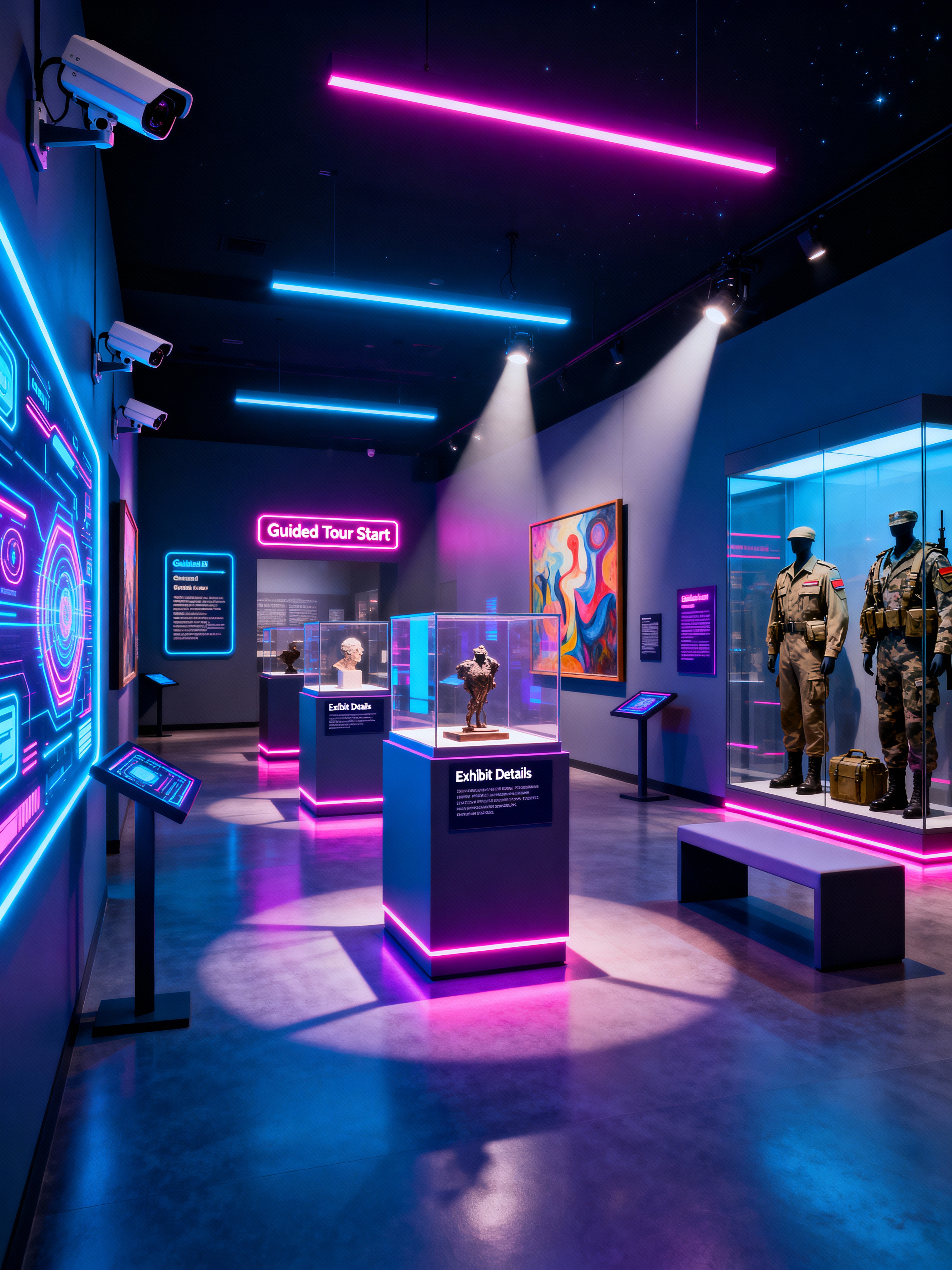 museum hall with cyberpunk style with security cameras and interactive displays and guided tour signs and pedestals and information plaques and spotlights and artifacts and display cases. . with synthwave and dark night and surrealist paintings and cyberpunk style and cyberpunk lights and military uniforms and gear and minimalist and bladerunner lights