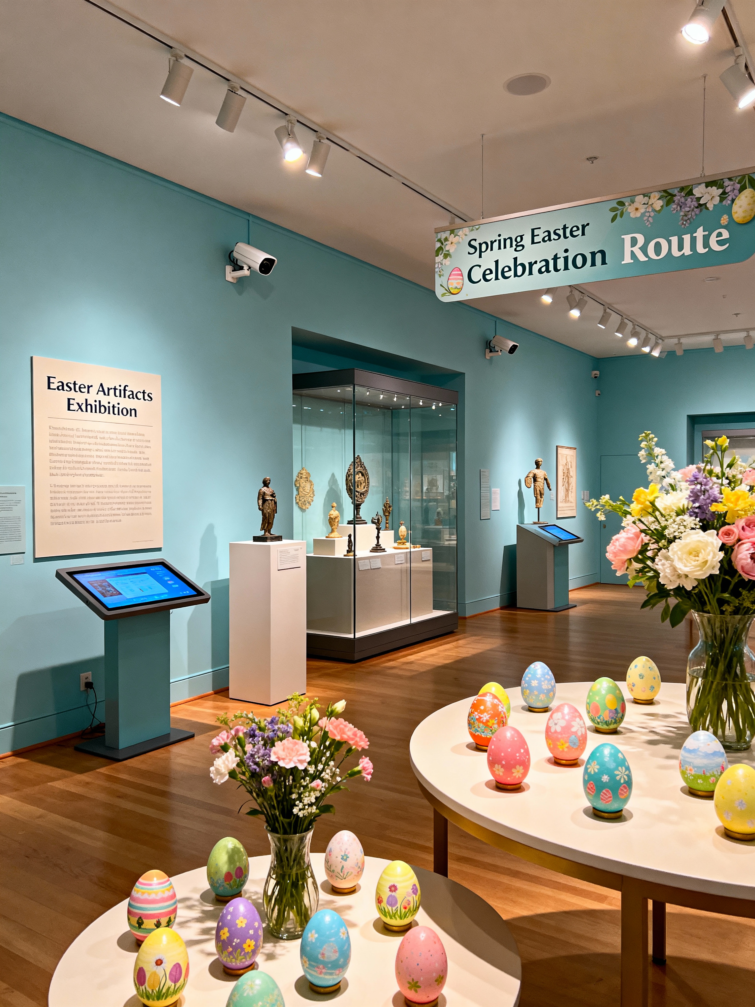museum hall with easter style with information plaques and interactive displays and pedestals and display cases and security cameras and guided tour signs and artifacts and spotlights. . with easter decorations and spring decorations and colorful easter eggs and flowers on table and light blue colors and easter decorations