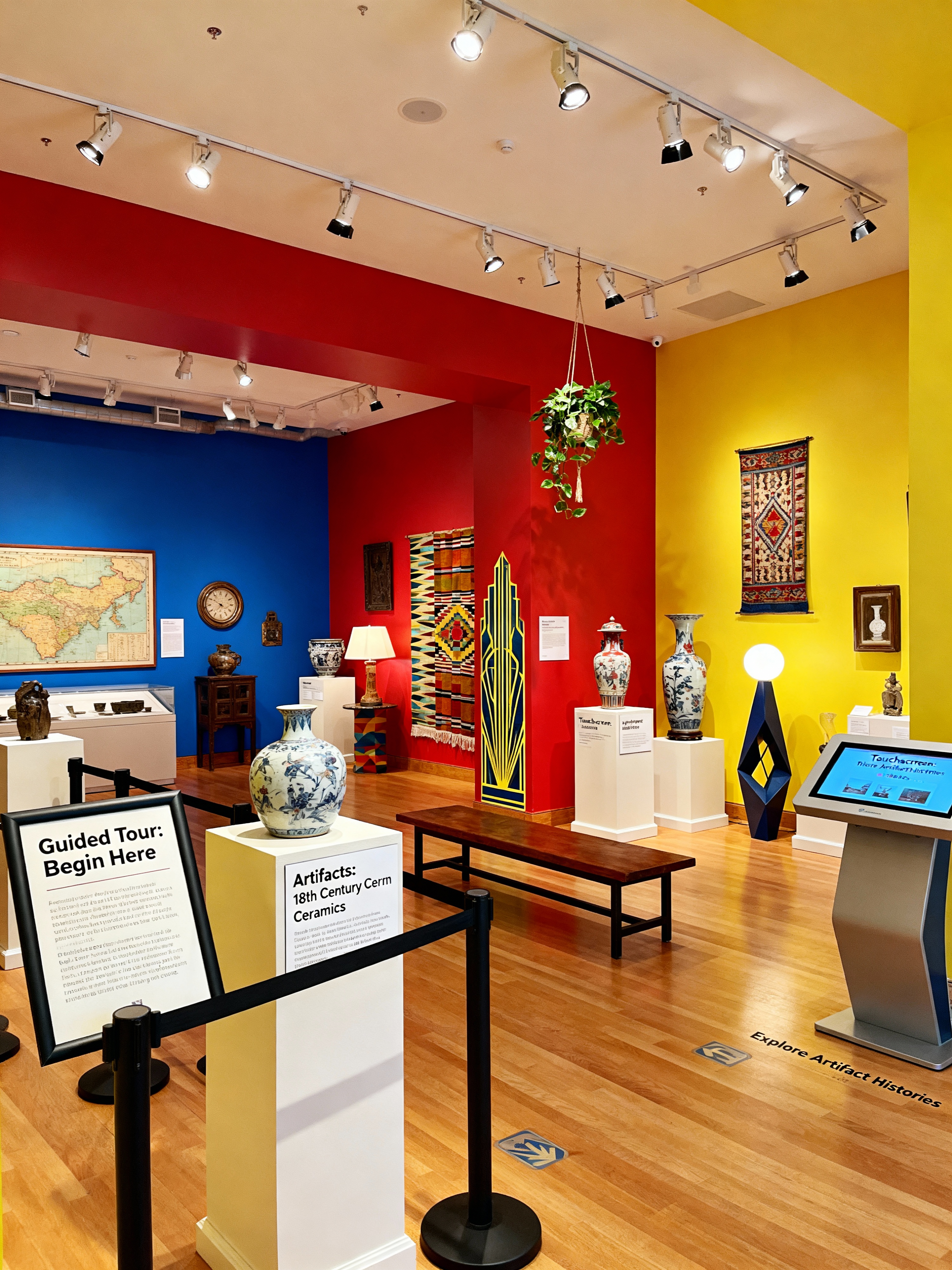 museum hall with eclectic style with pedestals and guided tour signs and information plaques and interactive displays and barriers and benches and artifacts and spotlights. . with personal expression and colorful palette and creative freedom and unique pieces and mixed styles and global influences and vintage finds and unexpected elements