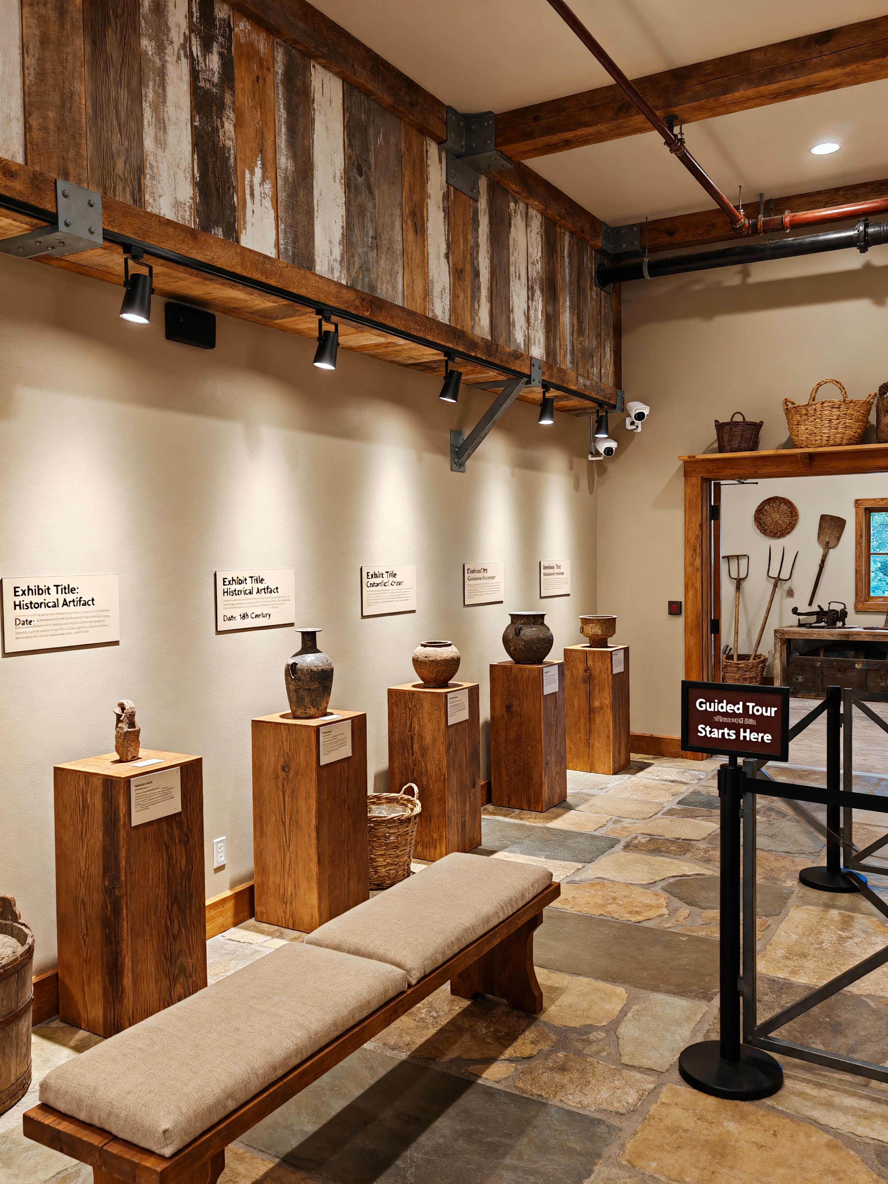 museum hall with farmhouse style with artifacts and information plaques and spotlights and benches and security cameras and pedestals and guided tour signs and barriers. . with exposed wood and natural textures and country style and cozy feel and rustic charm and open shelving and neutral tones and industrial accents