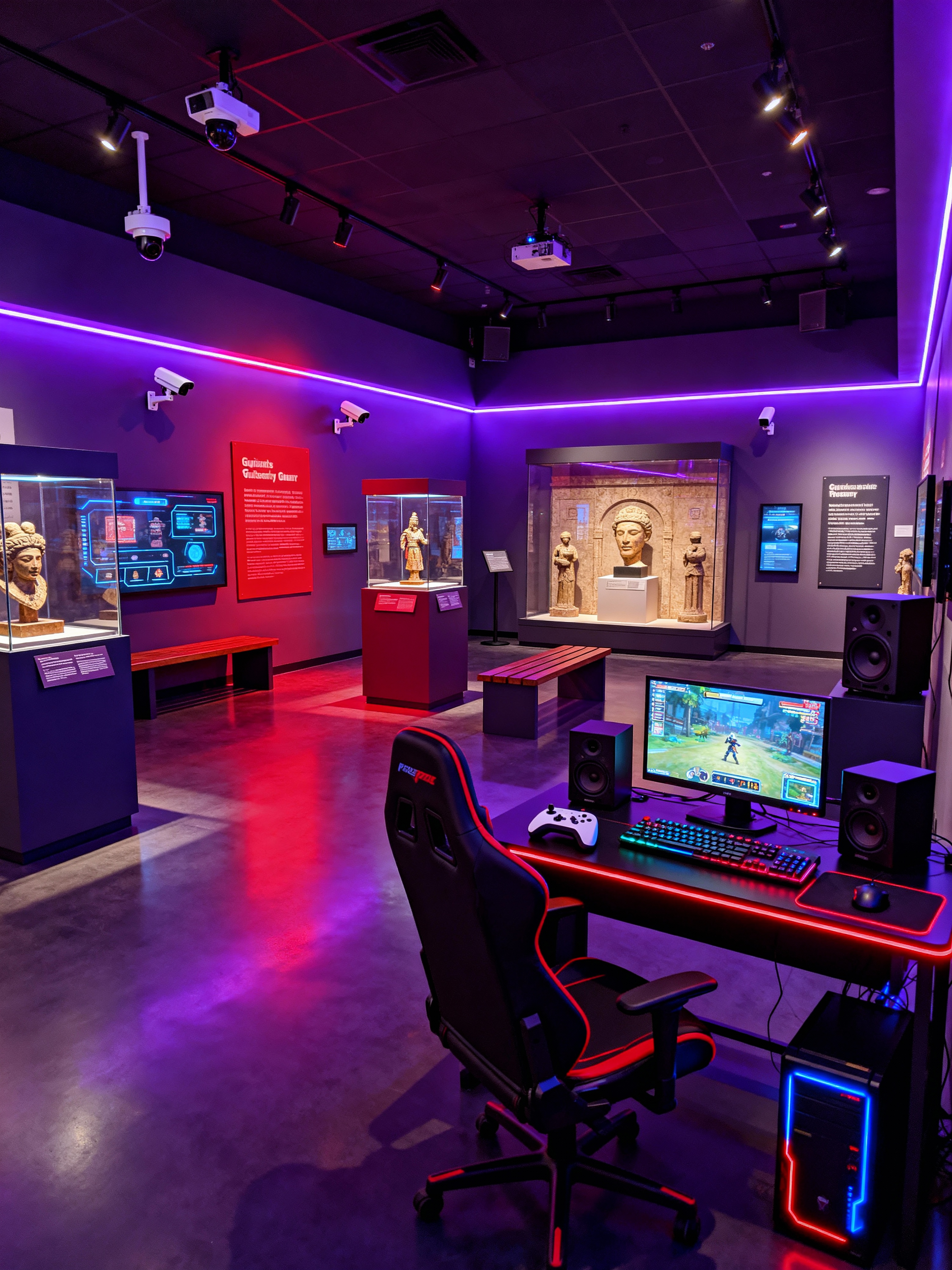 museum hall with gaming room style with security cameras and interactive displays and artifacts and guided tour signs and display cases and benches and information plaques and pedestals. . with multiple displays and speakers and gaming chair and at night and neon lights and purple and red lights and computer desk with computer displays and keyboard and video game consoles