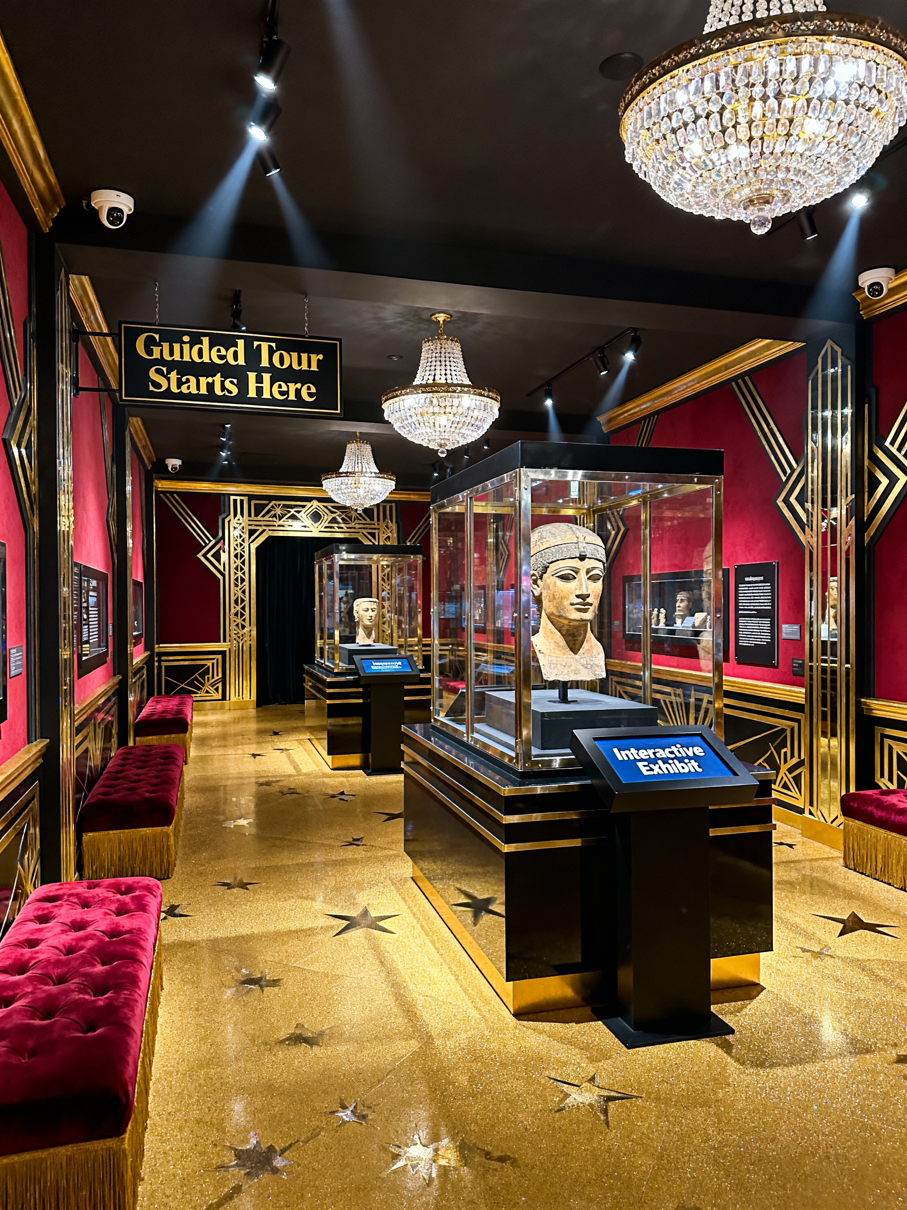 museum hall with hollywood glam style with barriers and guided tour signs and security cameras and display cases and artifacts and benches and interactive displays and spotlights. . with bold colors and crystal chandeliers and dramatic lighting and velvet upholstery and star quality and glamorous style and art deco influence and opulent details