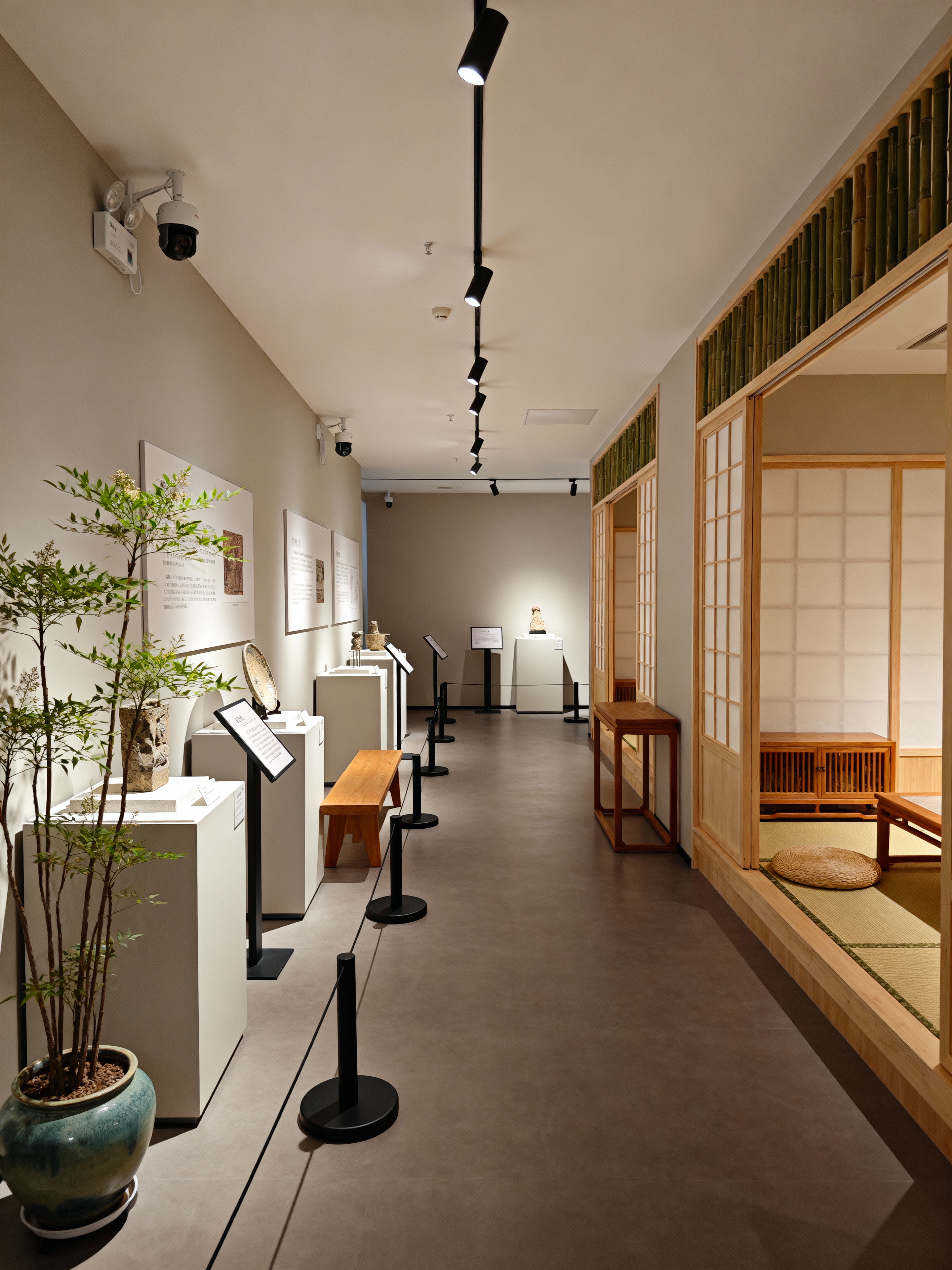 museum hall with japanese design style with pedestals and artifacts and information plaques and benches and guided tour signs and spotlights and security cameras and barriers. . with indoor plants and tatami mats and tranquility and bamboo accents and sliding doors and neutral colors and minimalism and low furniture