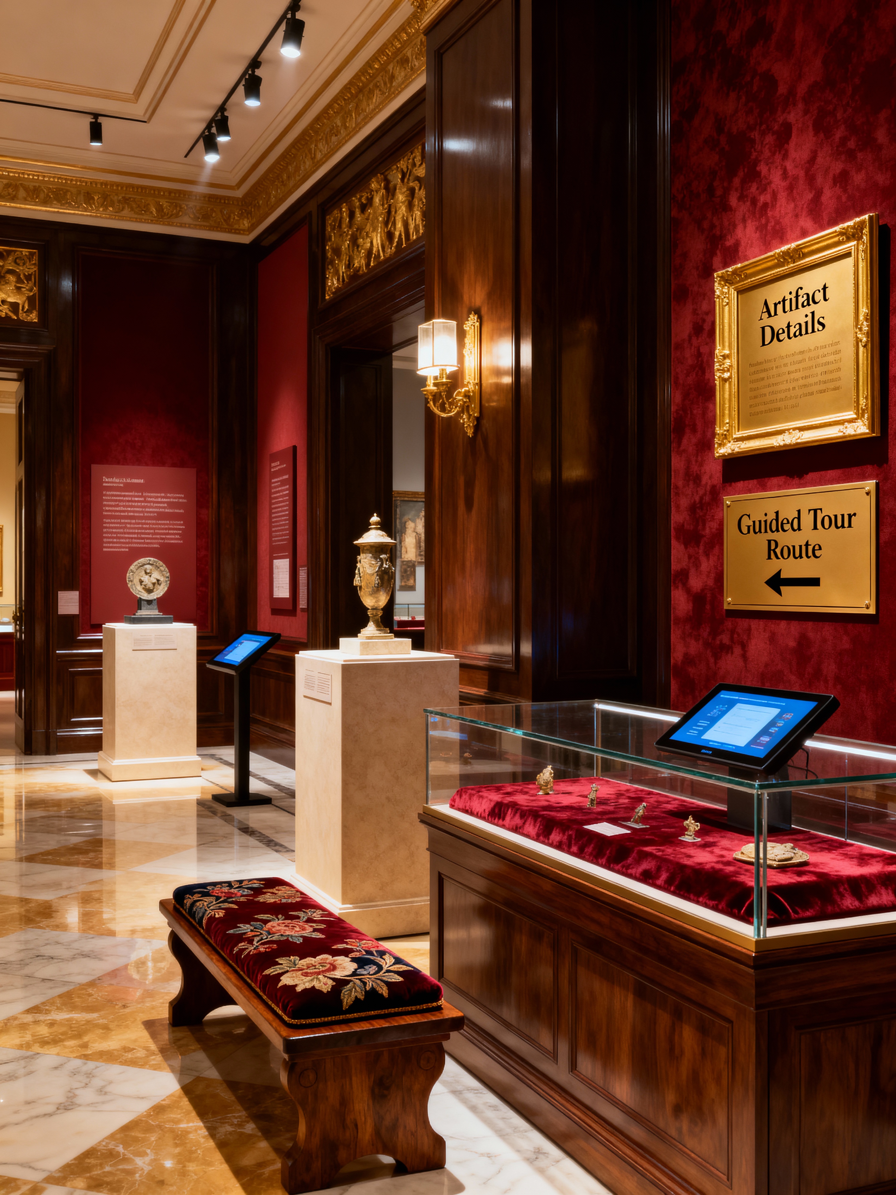 museum hall with luxury style with pedestals and spotlights and interactive displays and information plaques and display cases and benches and guided tour signs and artifacts. . with expensive fabrics and rich textures and exclusive design and custom pieces and sophisticated style and high-end materials and premium finishes and opulent details