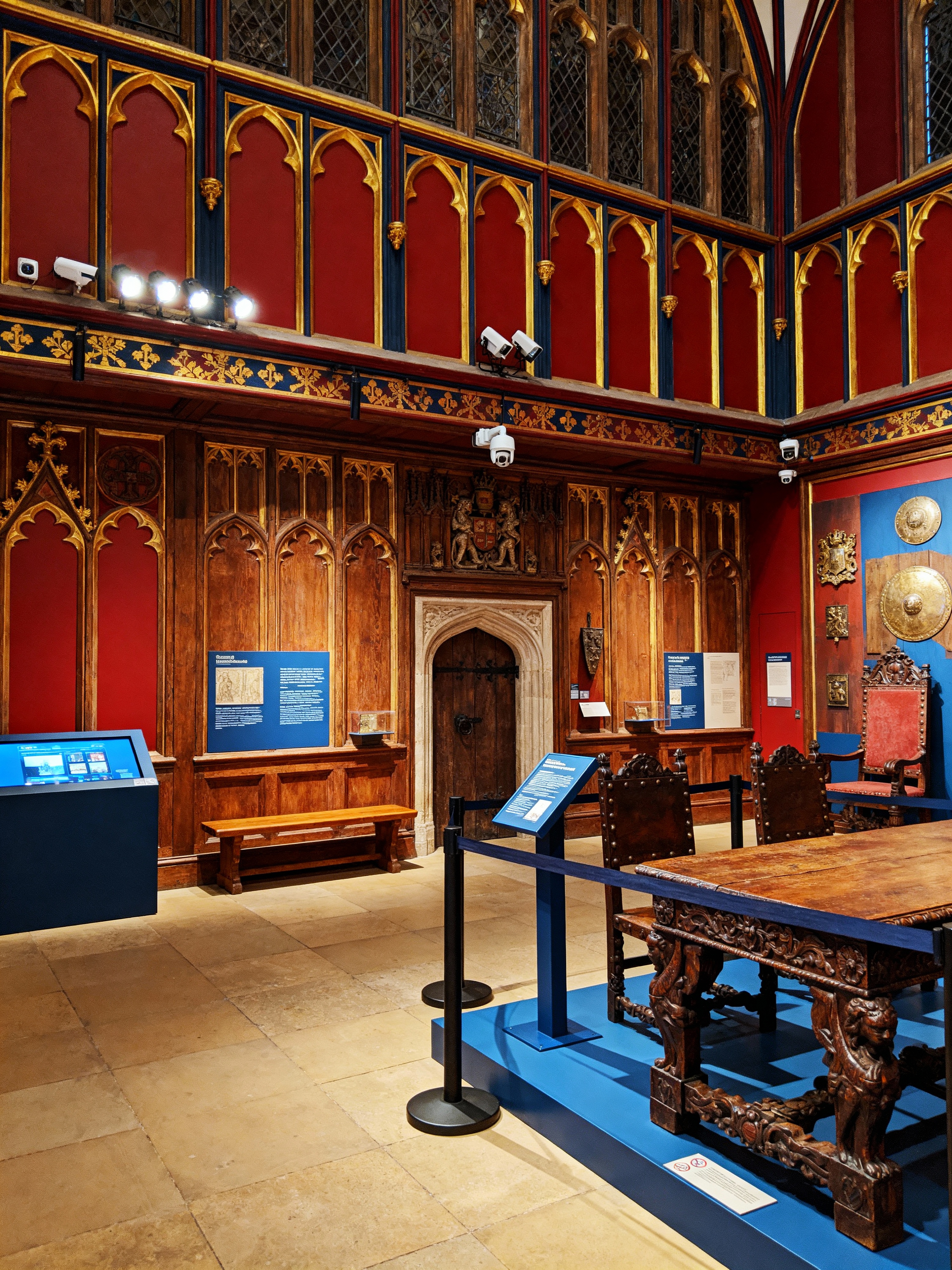 museum hall with medieval style with information plaques and security cameras and artifacts and guided tour signs and barriers and interactive displays and benches and spotlights. . with intricate wooden inlay designs and carvings and carved wooden tables and deep colors like red, gold, or blue and timber walls and carved wooden chairs and gothic appearance and castle interior and heavy furniture pieces