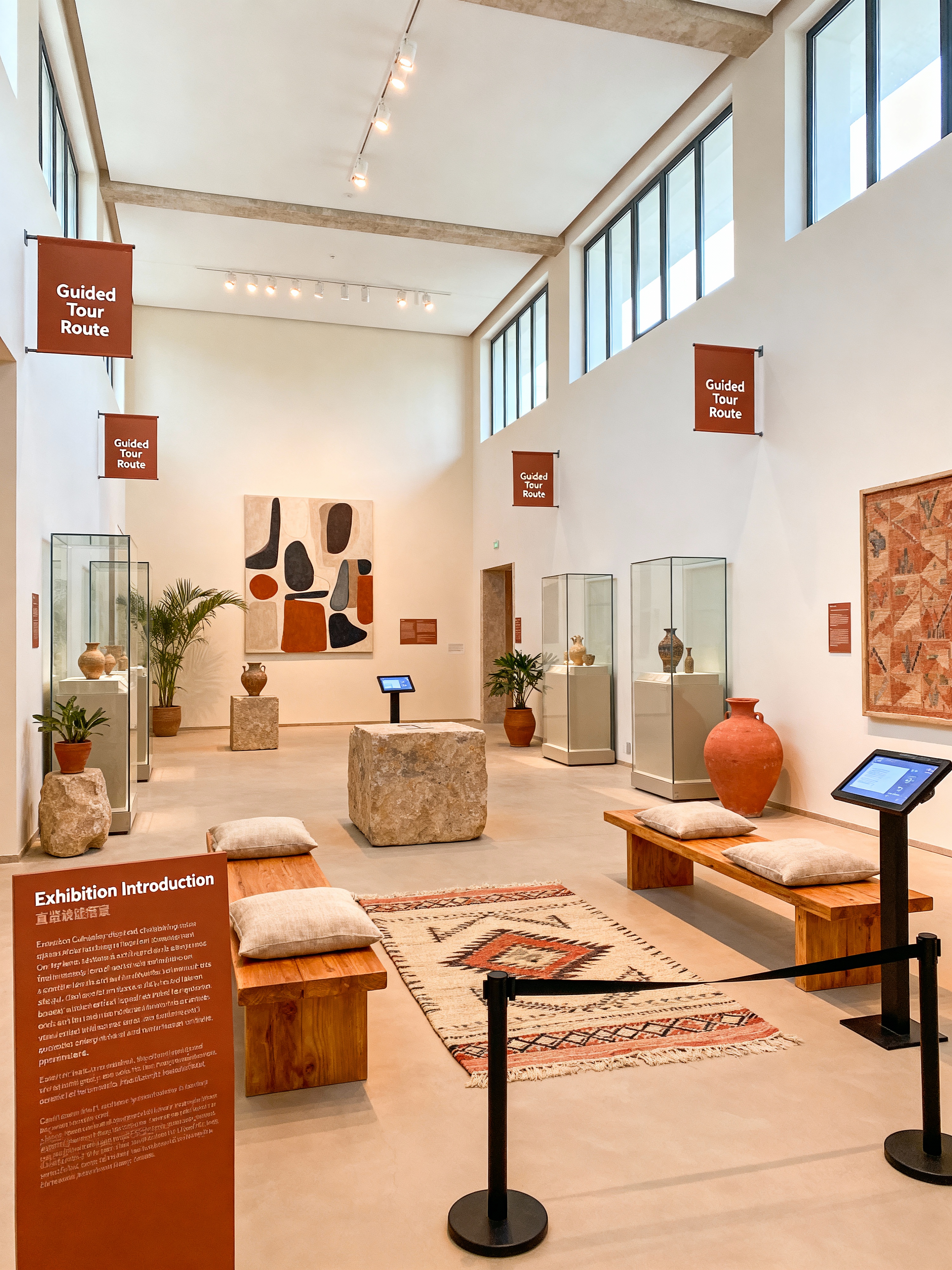 museum hall with modern boho style with information plaques and benches and interactive displays and spotlights and display cases and guided tour signs and pedestals and barriers. . with neutral palette and airy space and bohemian style and minimalist and linen fabric and expressive decor and warm colors and artistic decor