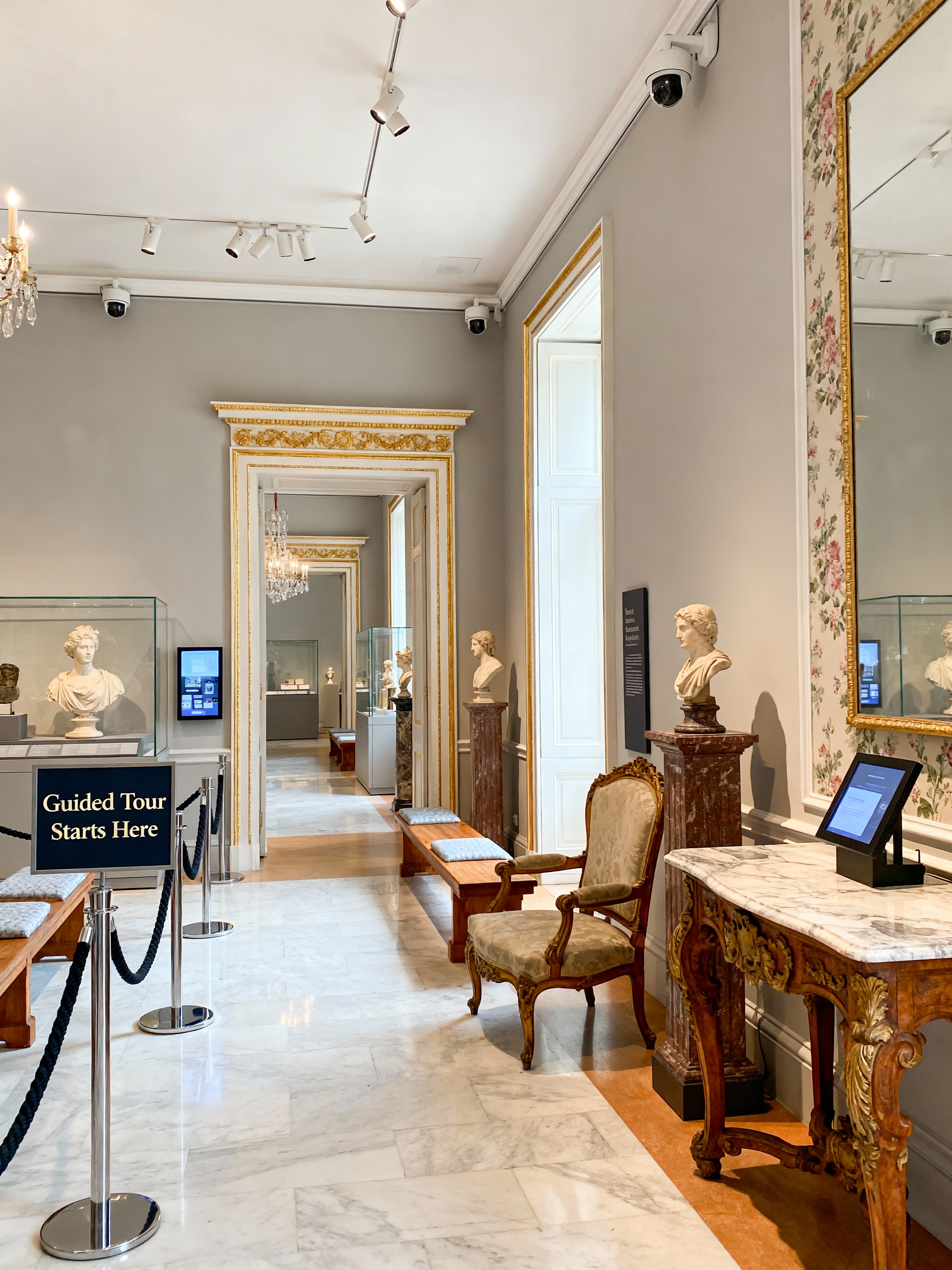 museum hall with parisian style with artifacts and security cameras and guided tour signs and barriers and display cases and pedestals and benches and interactive displays. . with antique furniture and neutral palette and european flair and refined style and french elegance and timeless beauty and chic simplicity and classic details