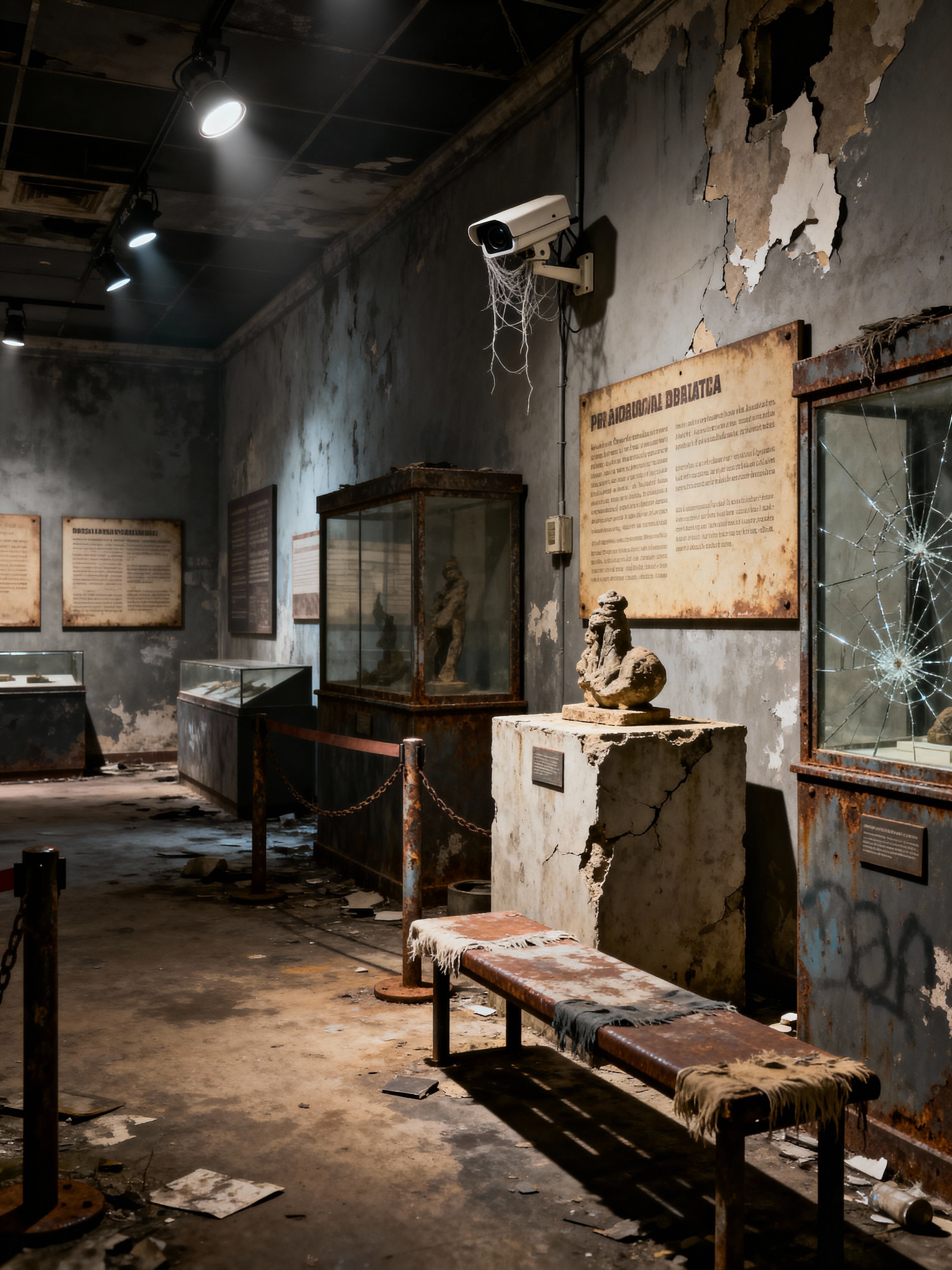 museum hall with post-apocalyptic style with information plaques and spot and benches and artifacts and barriers and security cameras and display cases and pedestals. . with worn textures and makeshift furniture and run-down favela style and gritty atmosphere and abandoned look and neglected atmosphere and urbex and distressed furniture