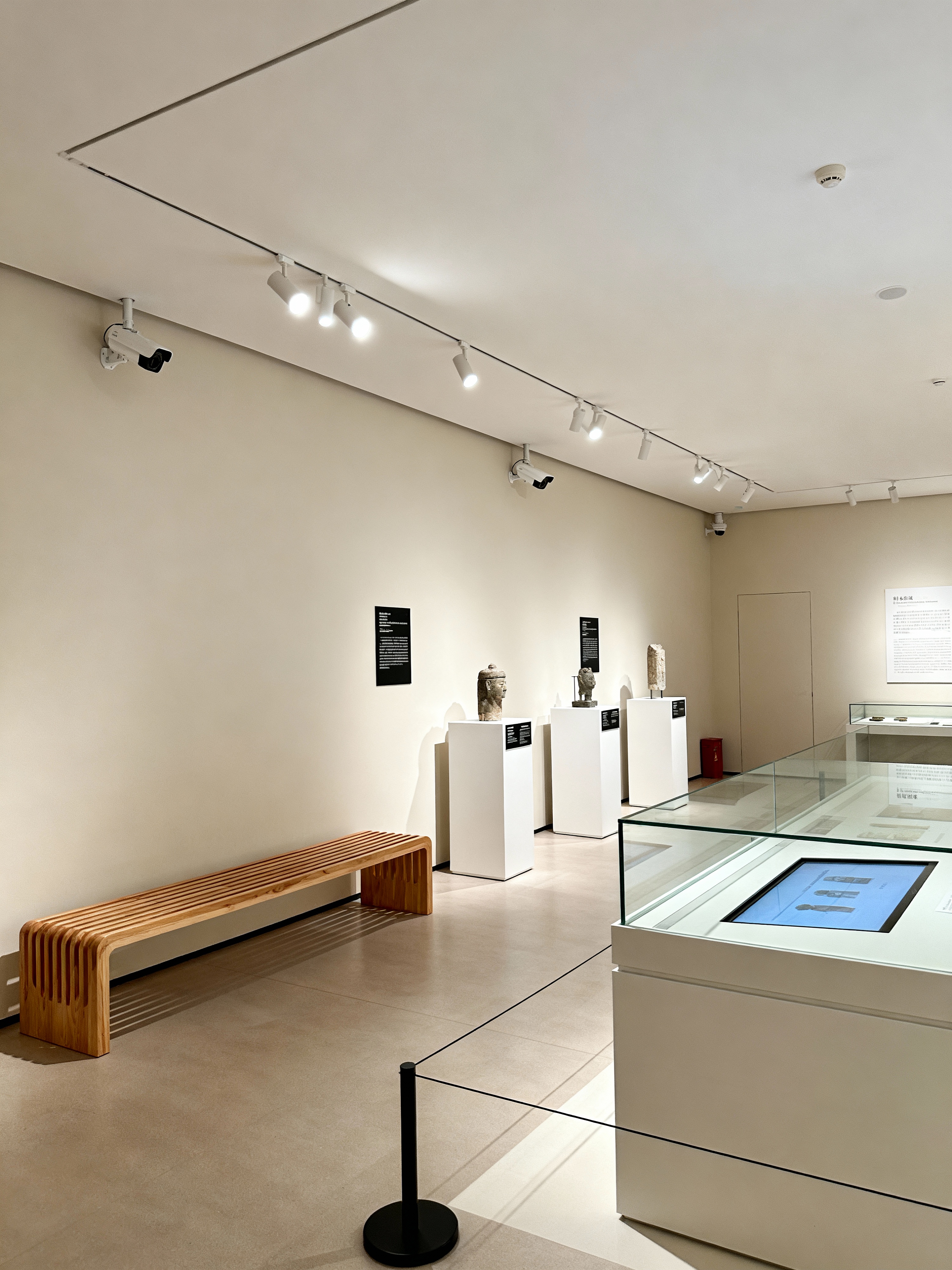 museum hall with simple style with security cameras and spotlights and benches and information plaques and artifacts and barriers and interactive displays and pedestals. . with functional furniture and basic elements and clean design and minimal decor and neutral colors and streamlined look and essential pieces and uncluttered space